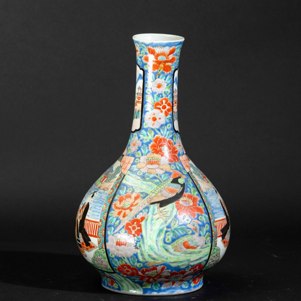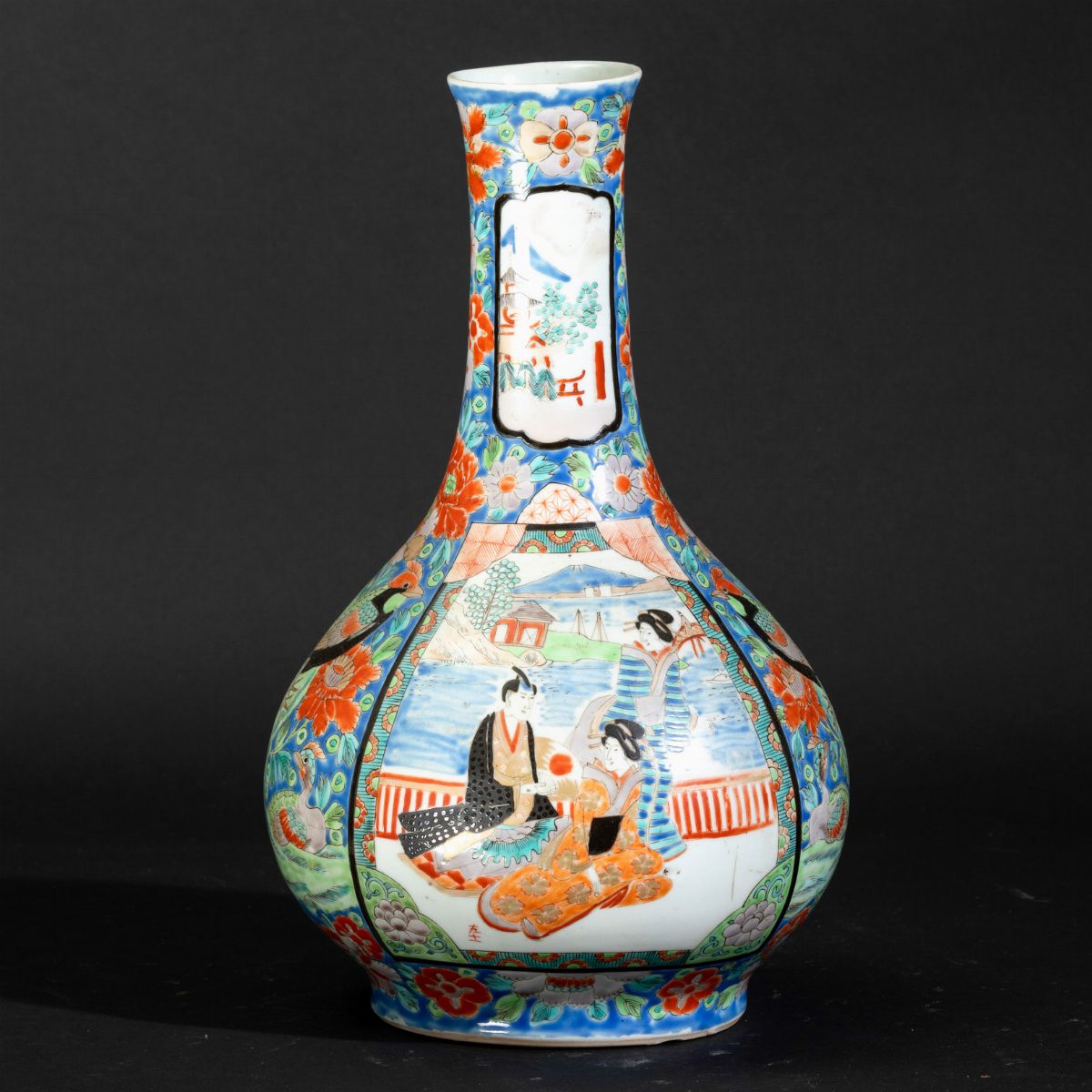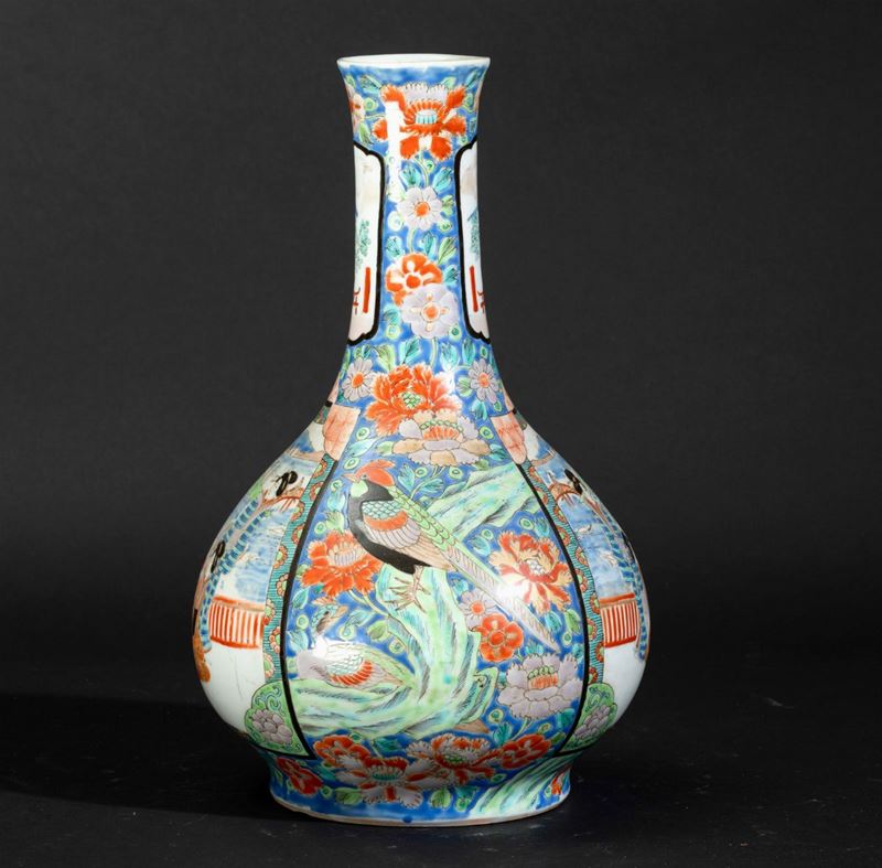 Vaso a bottiglia in porcellana con decori floreali e scene di vita comune entro riserve, Giappone, XIX secolo