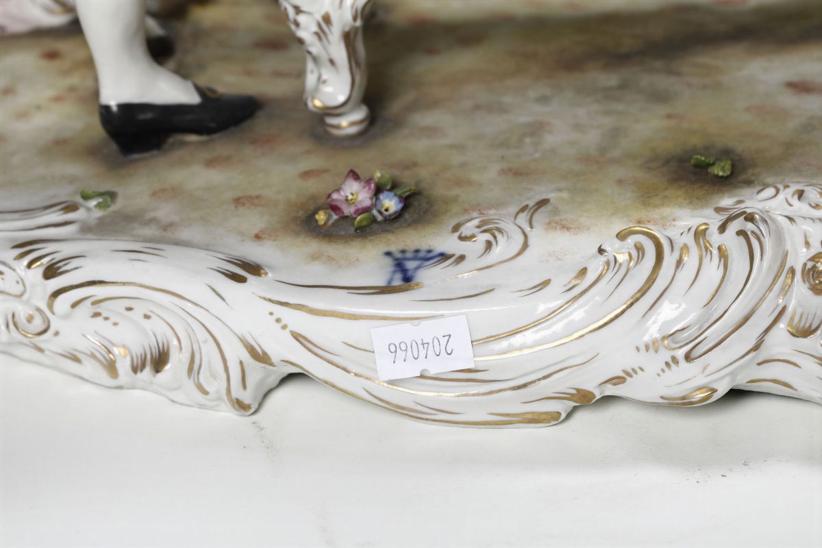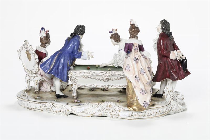 Il gruppo raffigura un gruppo con tre gentiluomini e due dame in abiti settecenteschi. In primo piano stemma con corona reale della dinastia Borbone di Francia