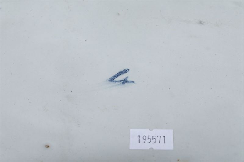 Maiolica a gran fuoco. Marca: su un piatto “G” oppure “4” in blu. Dimensioni: 1 pezzo cm 41,5 x 55; 1 pezzo cm 27,5 x 37,5; 4 pezzi cm 25 x 34; 1 pezzo cm 22 x 30. Minime sbeccature ai bordi