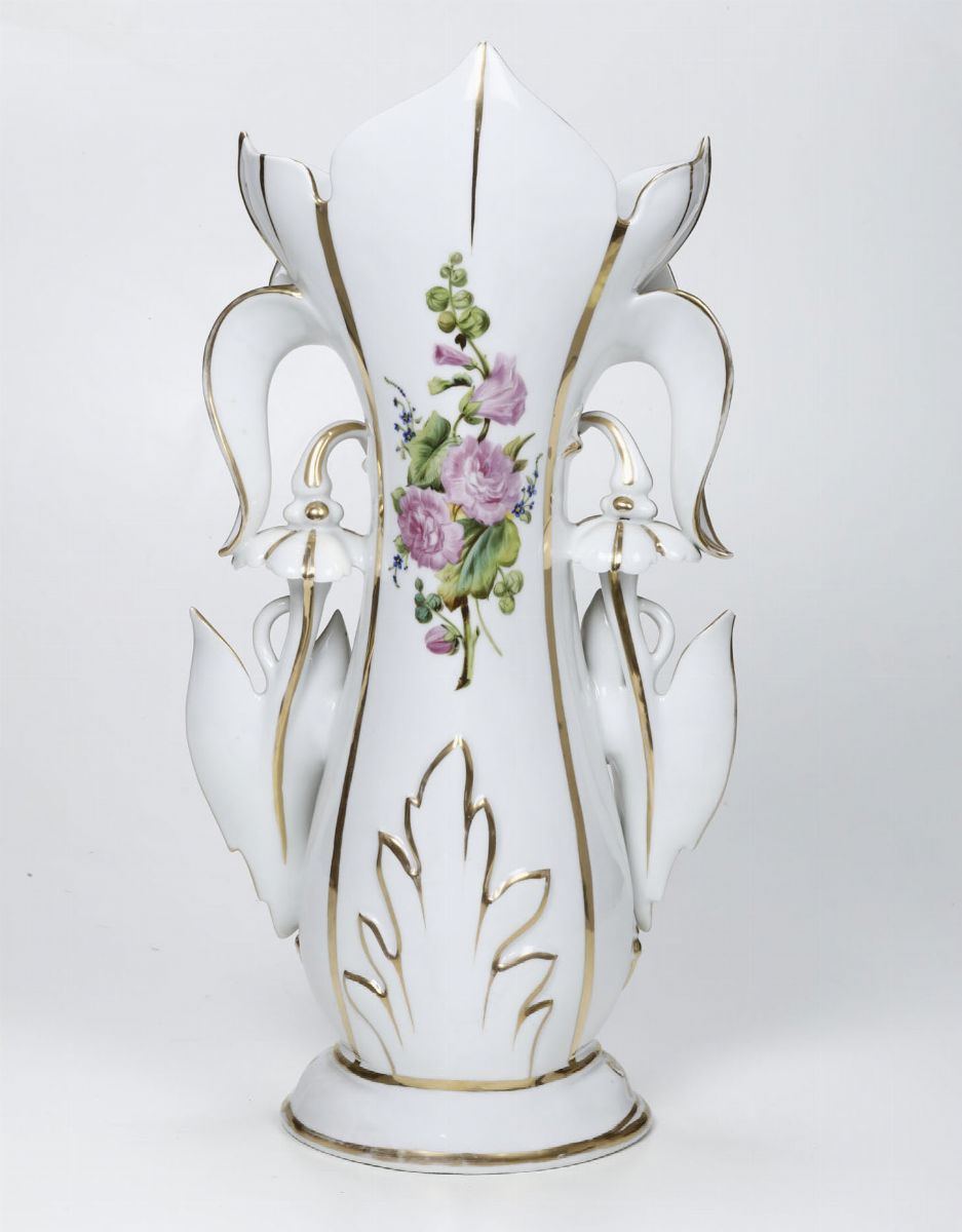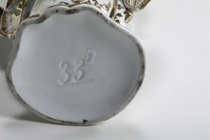 Porcellana. Marca: assente, numero “33” inciso. Altezza cm 55. Punta di una foglia mancante, leggere usure all’oro