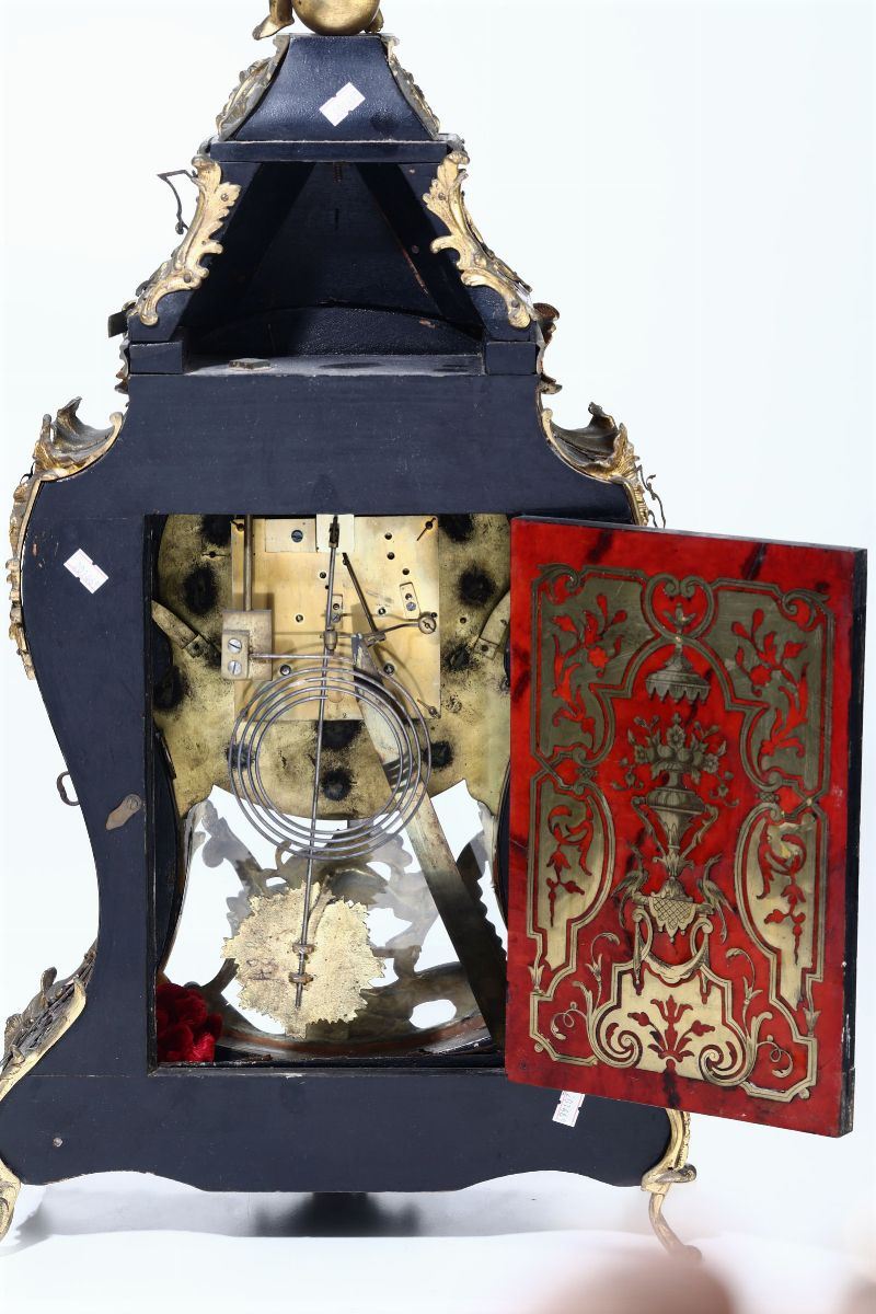 Cassa sagomata sormontata da figura di angelo, quadrante in metallo dorato con numerazione romana per le ore e araba per la minuteria, cm 40x14x80