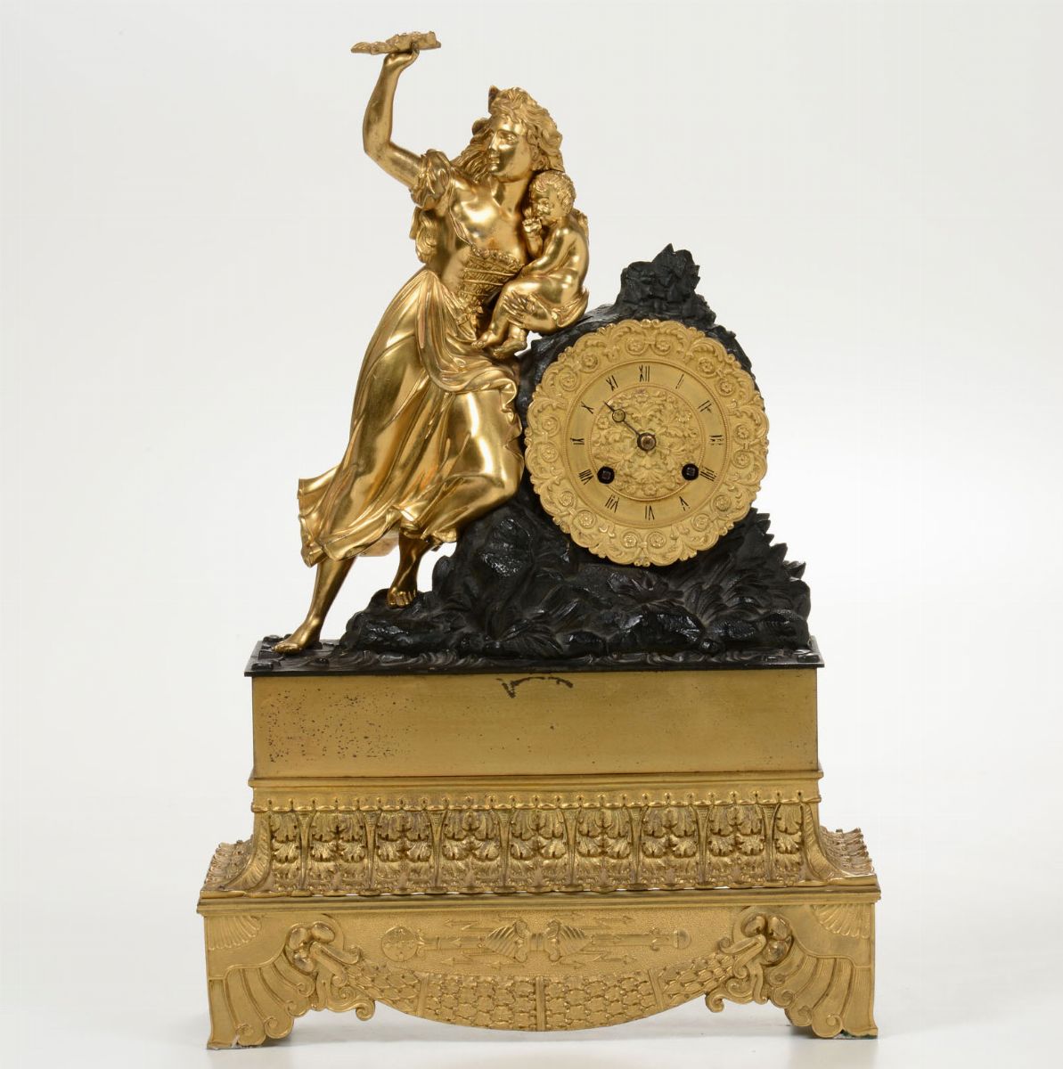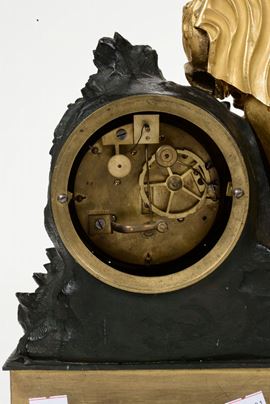 Cassa con figura femminile con bambino, quadrante a numerazione romana inserito entro base rocciosa, cm 30x12x43