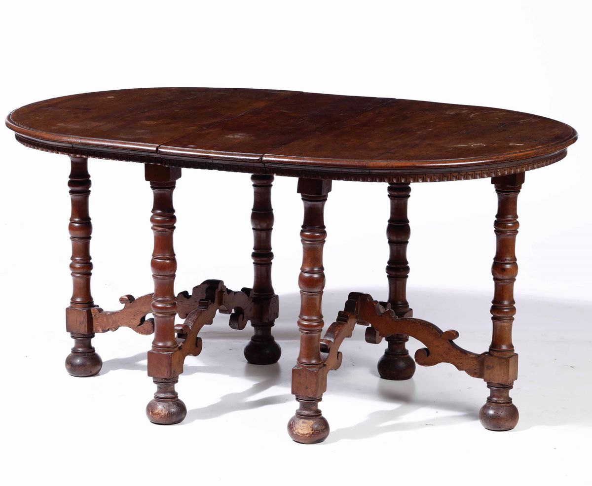 Tavolo ovale in legno con montanti a rocchetto, XIX secolo