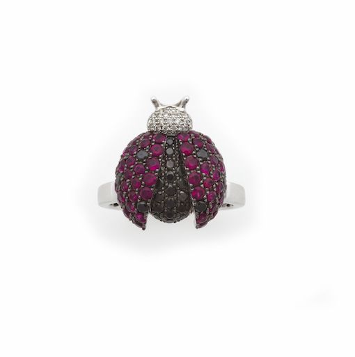 Anello coccinella con pavé di rubini, diamanti neri e diamanti