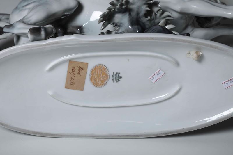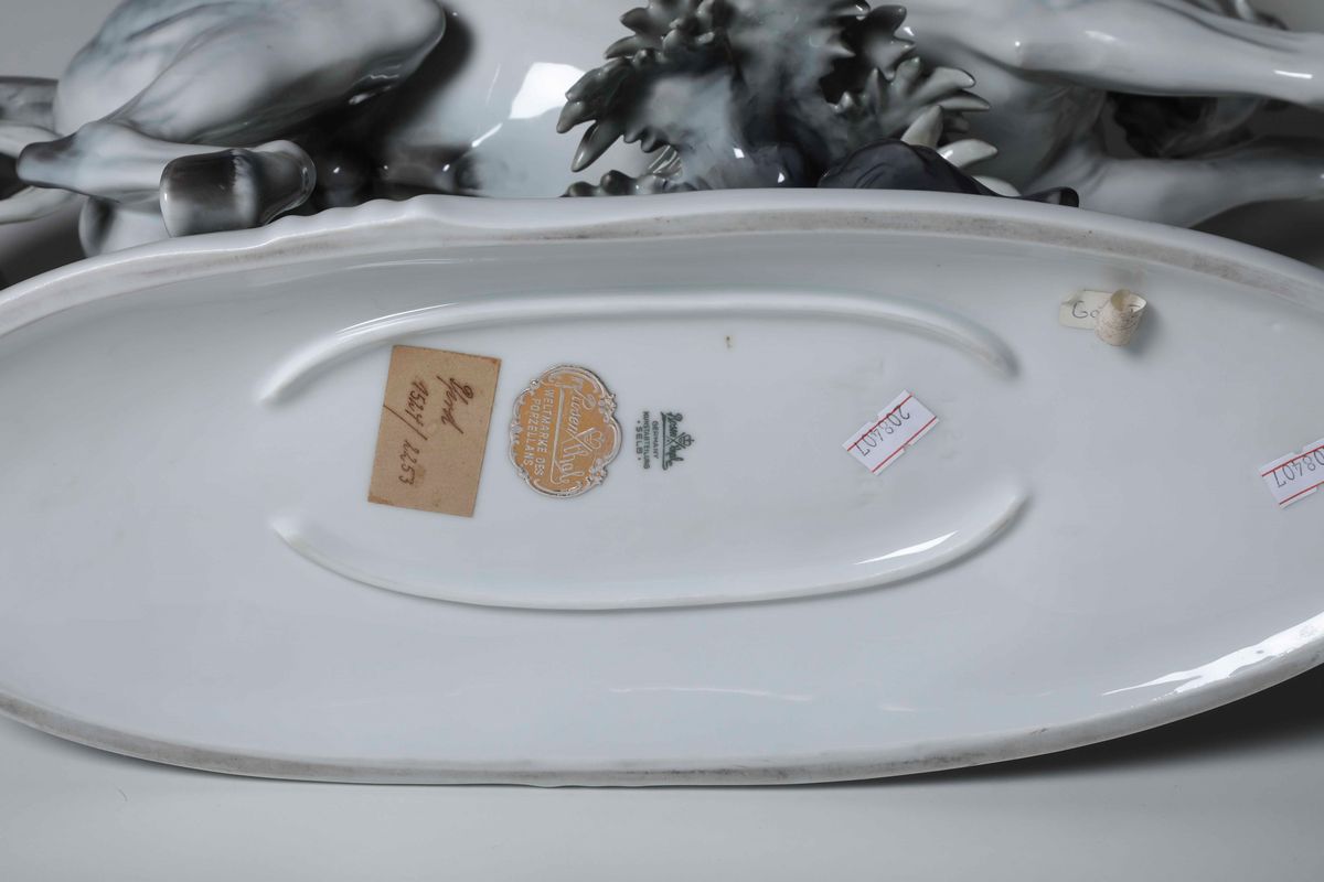 Porcellana policroma. Marca: “Rosenthal” coronata tra due bastoni incrociati e “Germany Kunstabteilung Selb”, in verde; “Th. Kärner” e numero “1524” impresso; etichetta cartacea. Dimensioni: h. cm 40x54x16. Ottimo stato di conservazione