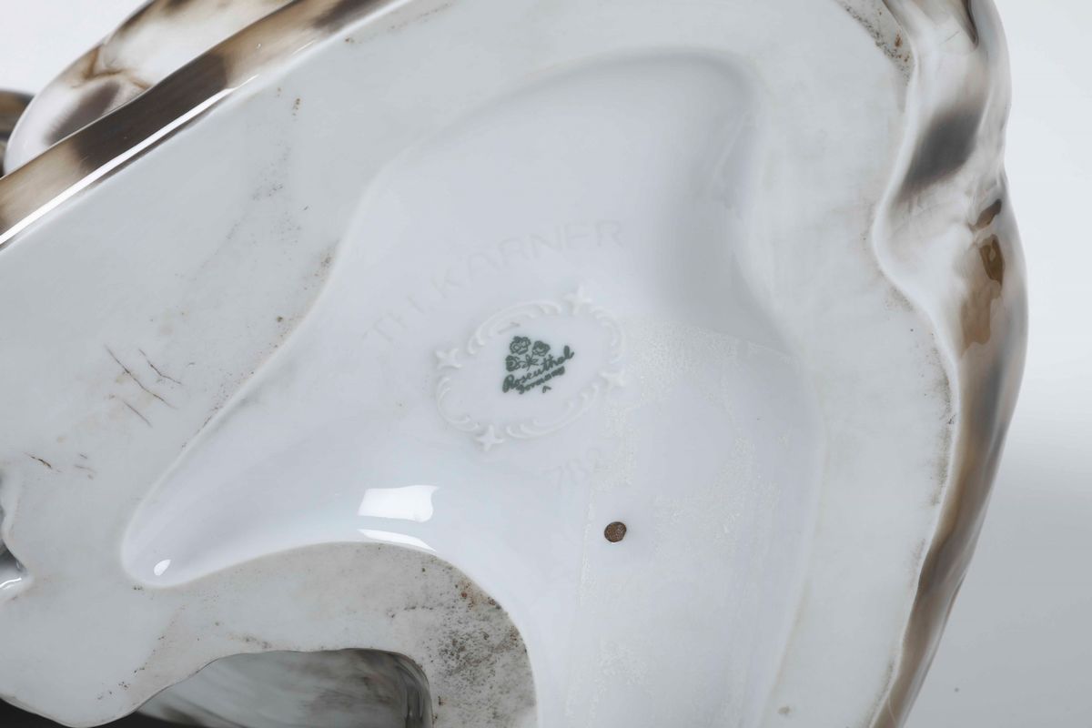 Porcellana policroma. Marca: due rose incrociate con corona e “Rosenthal Germany” in verde; “TH. Kärner” e “782” incisi. Dimensioni: h. cm 29x45x25. Ottimo stato di conservazione