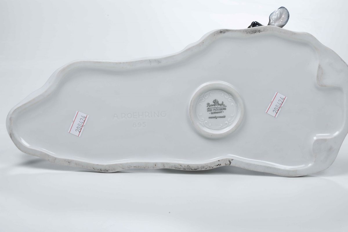 Porcellana policroma. Marca: due rose incrociate con corona e “Rosenthal Selb-Plössberg Germany handgemalt” in verde; “A.Roehring” e “895” impressi. Dimensioni: h. cm 17x32x13,5. Ottimo stato di conservazione