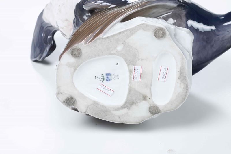 Porcellana policroma. Marca: simbolo della fabbrica con tre torri, “B&G KJOBENHAVN DENMARK 1744” in verde; “B & G” in blu. Dimensioni: h. cm 27x40x26,5. Ottimo stato di conservazione