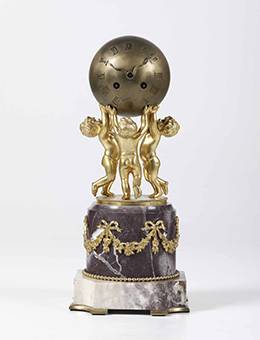 quadrante in ottone a numerazione romana per le ore affiancato da figura di Angelo e da colonna con busto maschile, cm 32x13x46