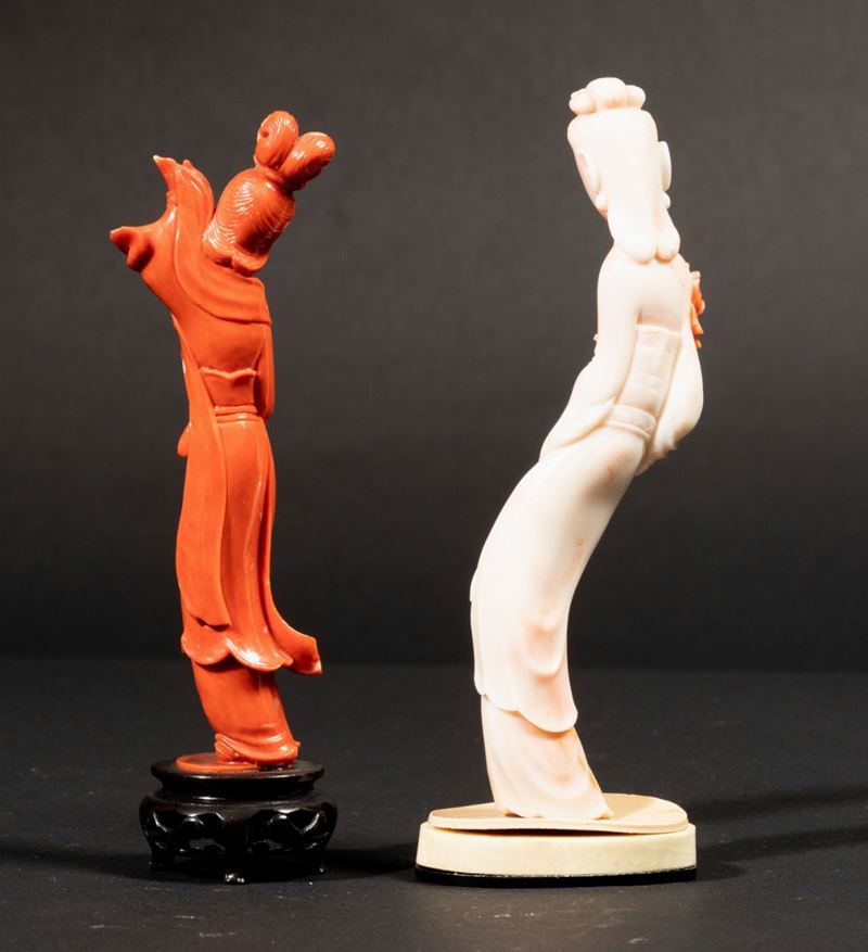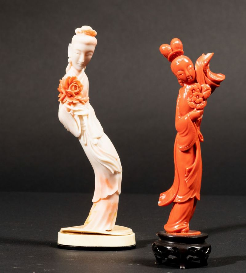 Due figure di fanciulle con fiori scolpite in corallo rosa e rosso, Cina, inizi XX secolo