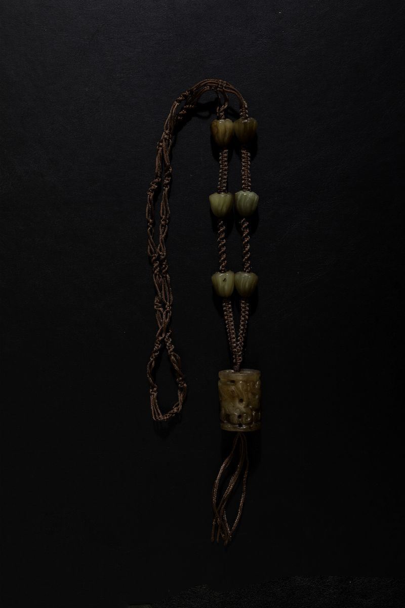 Lotto composto da ciondolo in giada con decori incisi e pietre dure e collana con perle in giada, Cina, XX secolo