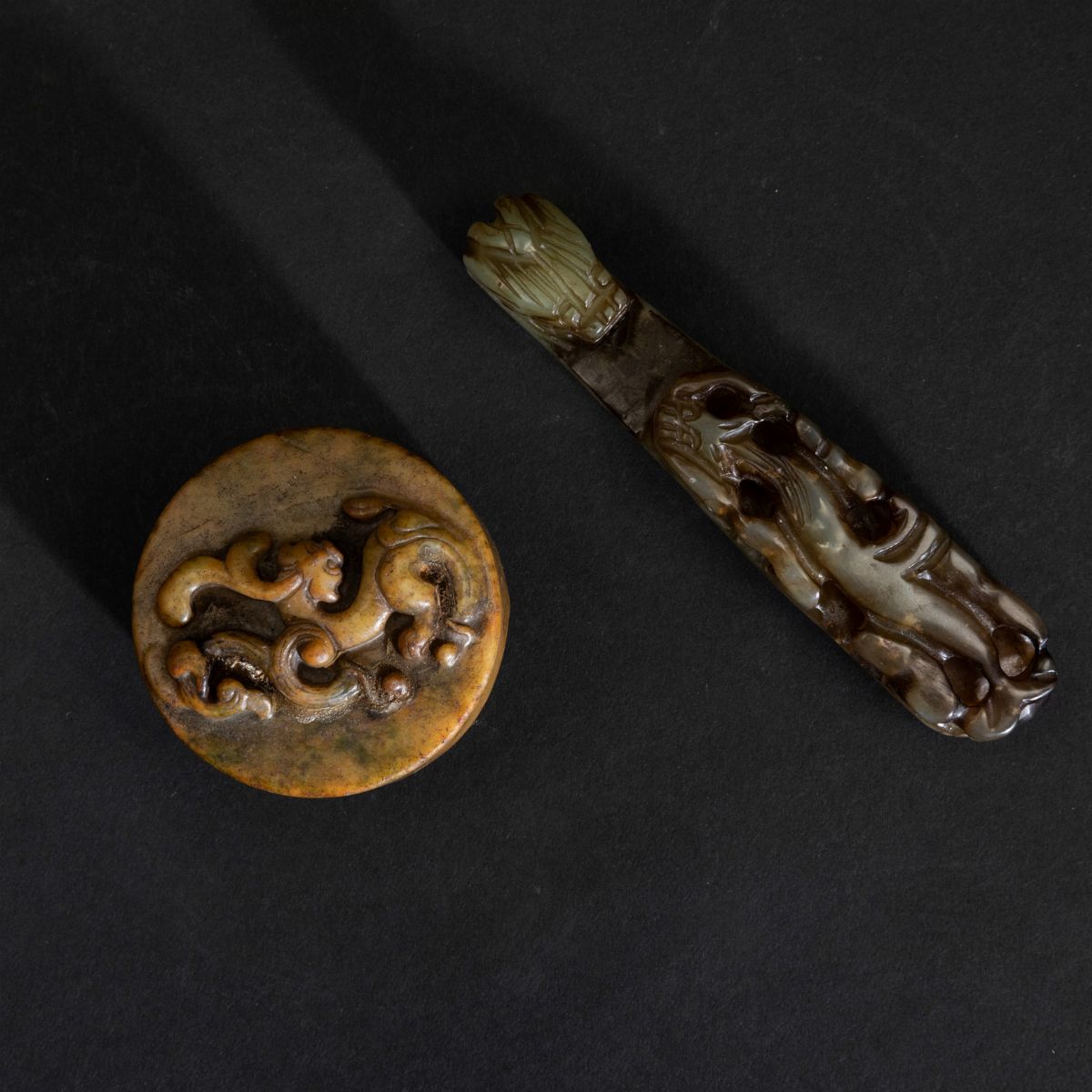 Lotto composto da fibbia a guisa di draghetto, sigillo circolare scolpito in giada con figura di drago a rilievo e sigillo in giada con figura di leone a rilievo, Cina, inizi XX secolo