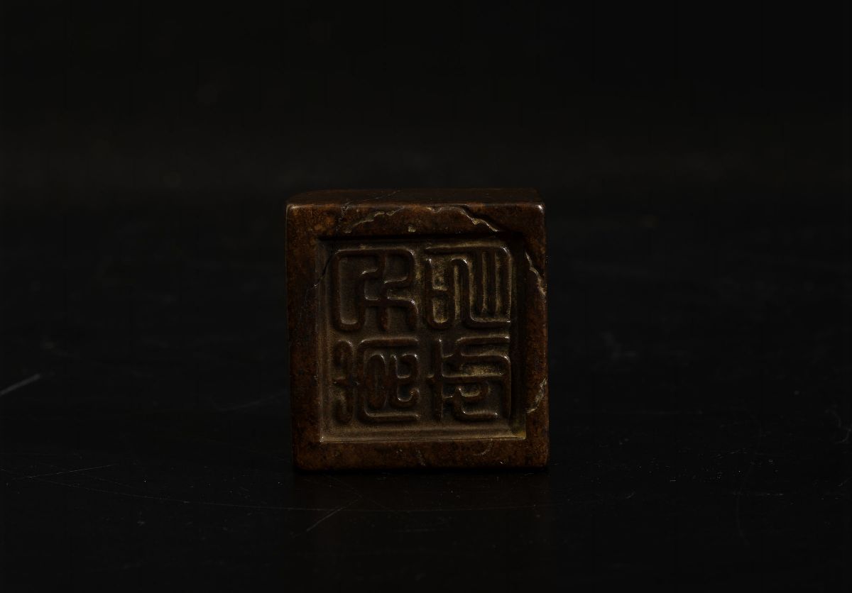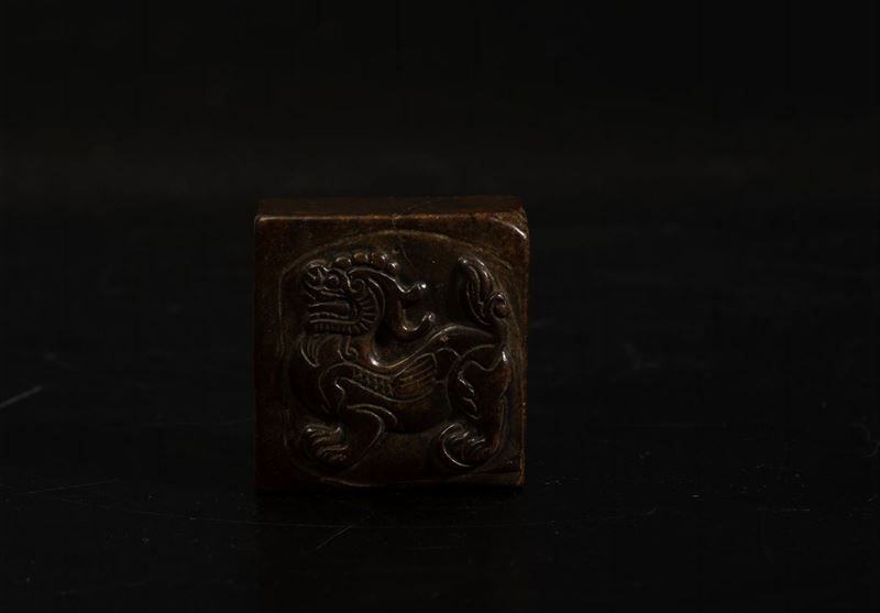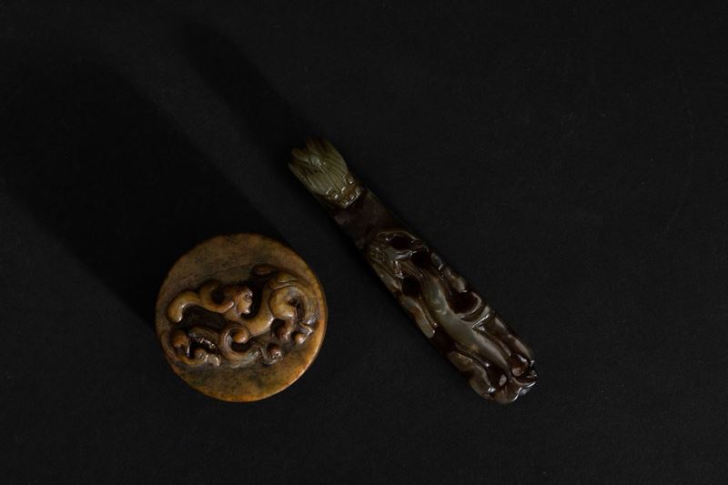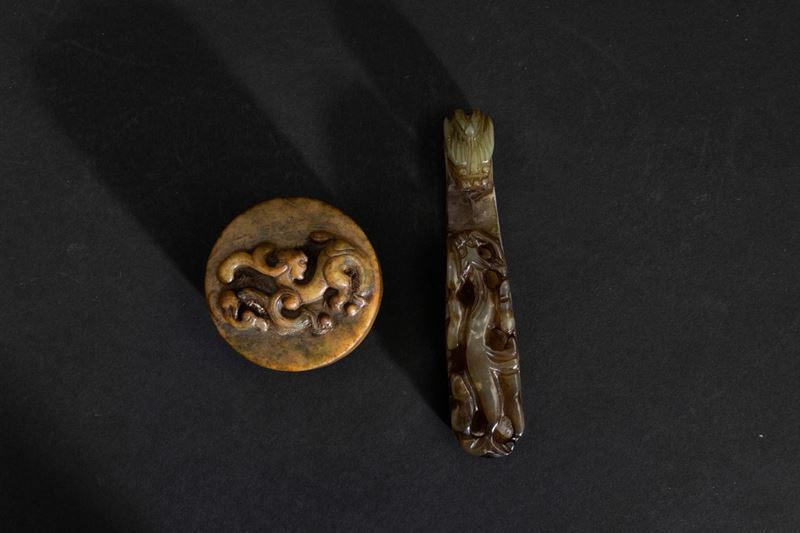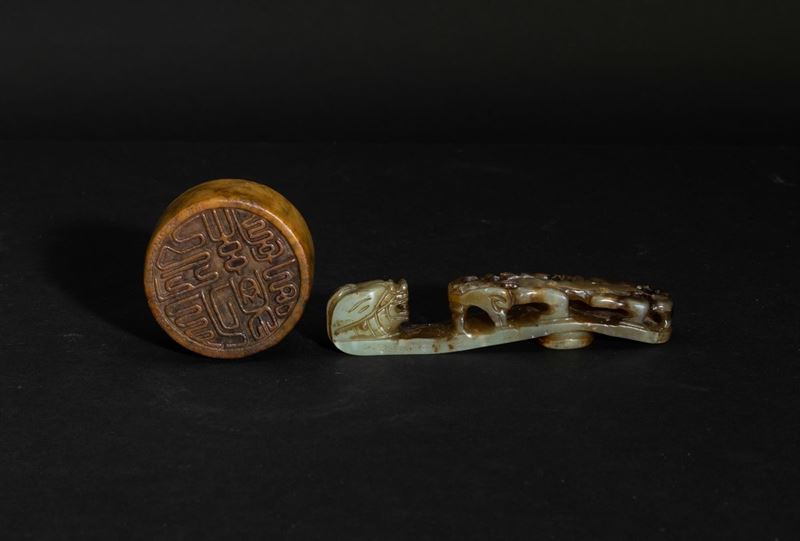 Lotto composto da fibbia a guisa di draghetto, sigillo circolare scolpito in giada con figura di drago a rilievo e sigillo [..]