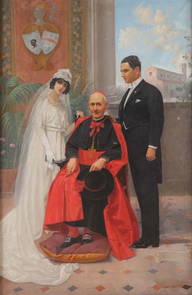 Il dipinto mostra il matrimonio tra il Conte Ghezzi con la Contessa Camilla, ritratti con il Vescovo di Arezzo Emanuele Mignone (1864 - 1961) che guidò la diocesi dagni anni’20 alla fine degli anni’50. Sullo sfondo la cattedrale di Arezzo con il campanile ancora privo della copertura a cuspide eseguita tra gli anni 1934 e 1937.