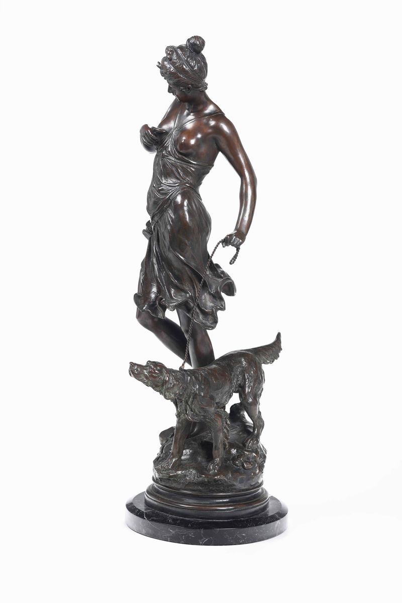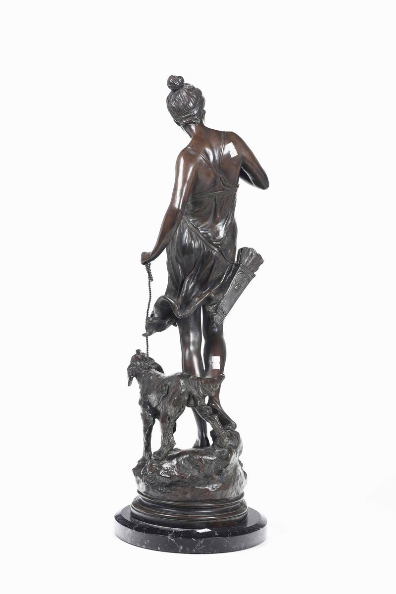 Diana cacciatrice in bronzo patinato e base in marmo. Fonditore del XIX-XX secolo
