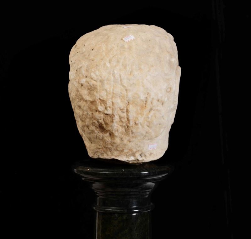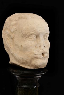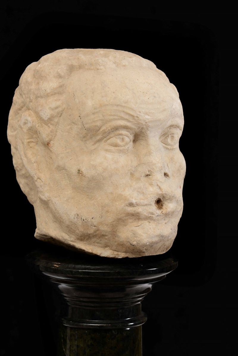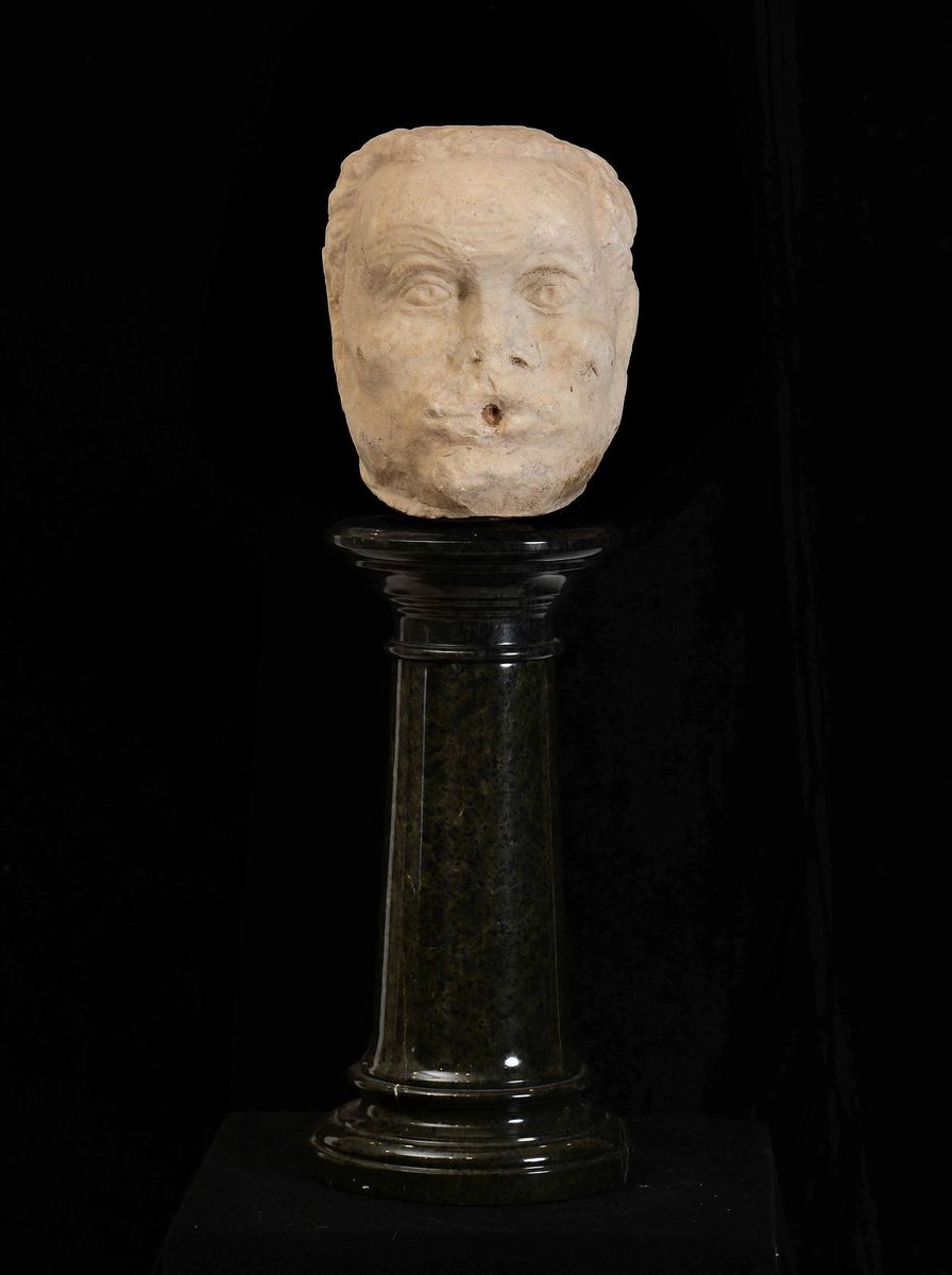 Mascherone in marmo bianco su base in marmo verde. Scultore del XX-XXI secolo