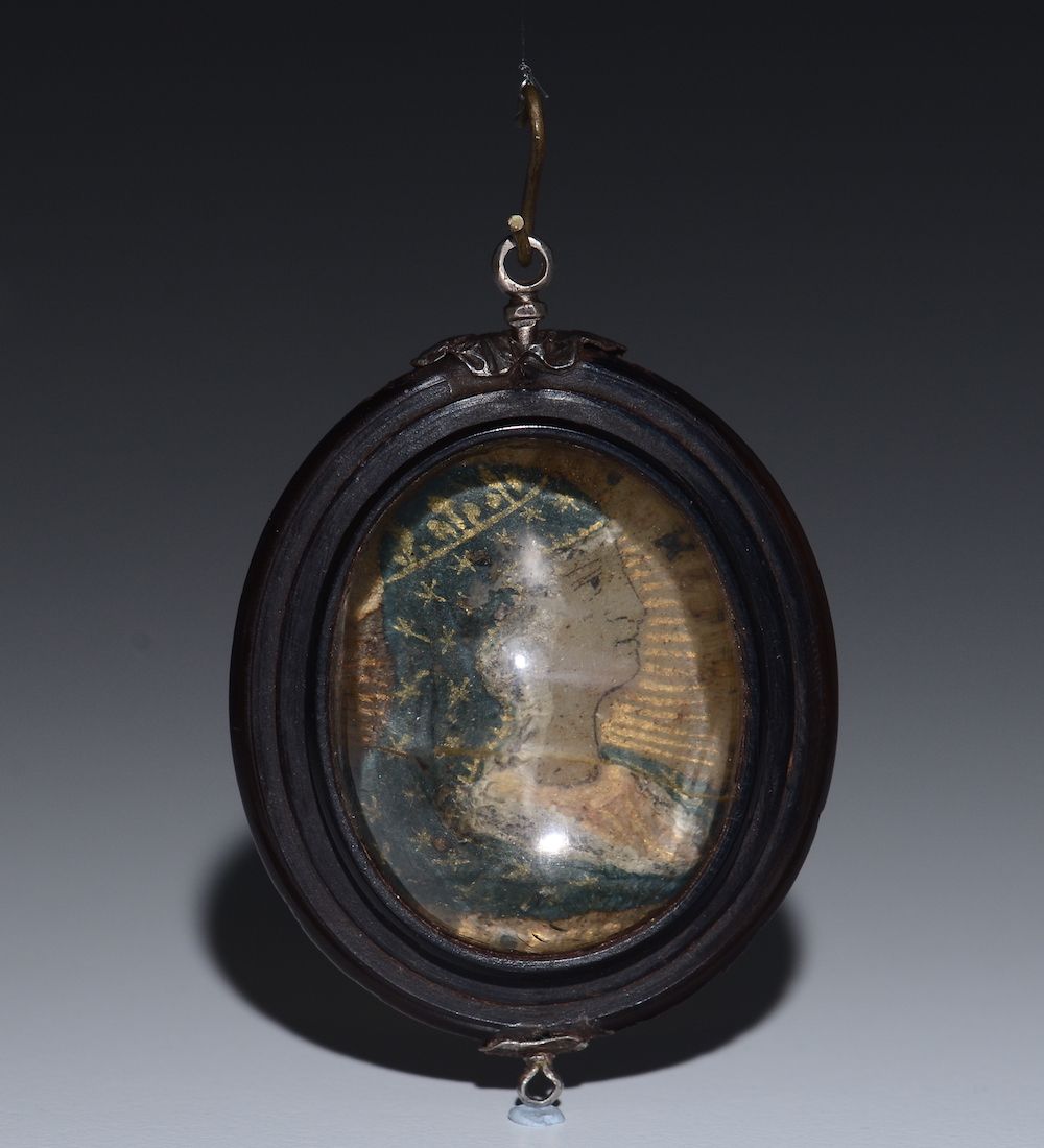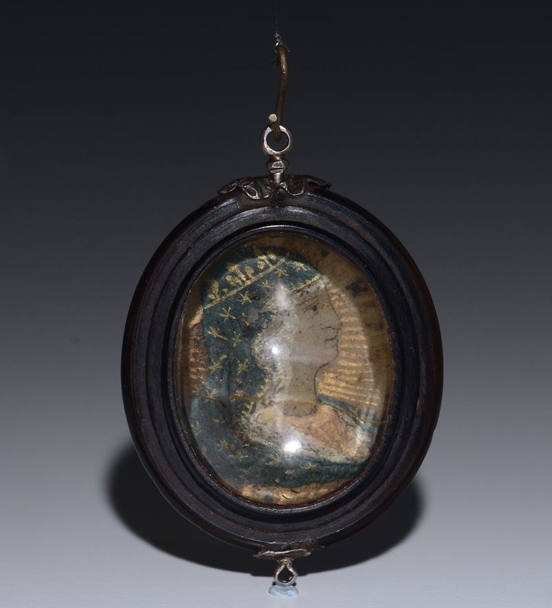 Sul fronte e sul retro raffigurazioni policrome del profilo di Cristo e della Madonna. Finimenti in argento.