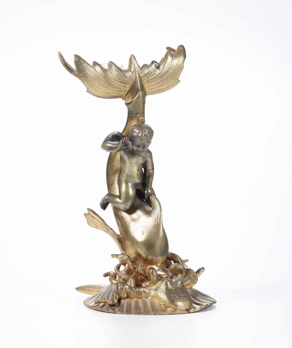 Putto che cavalca delfino in bronzo dorato. Fonditore del XX secolo
