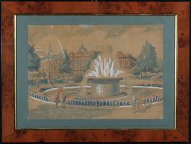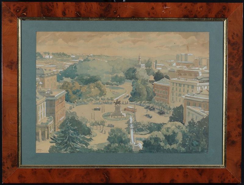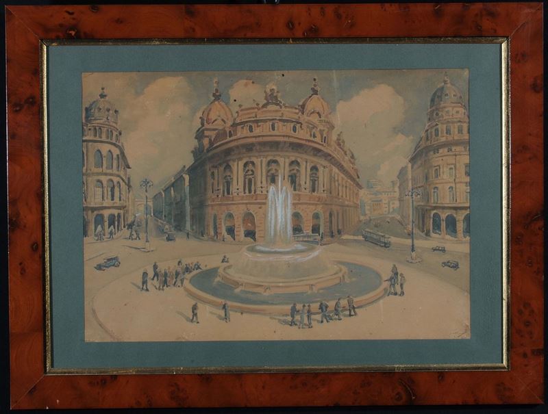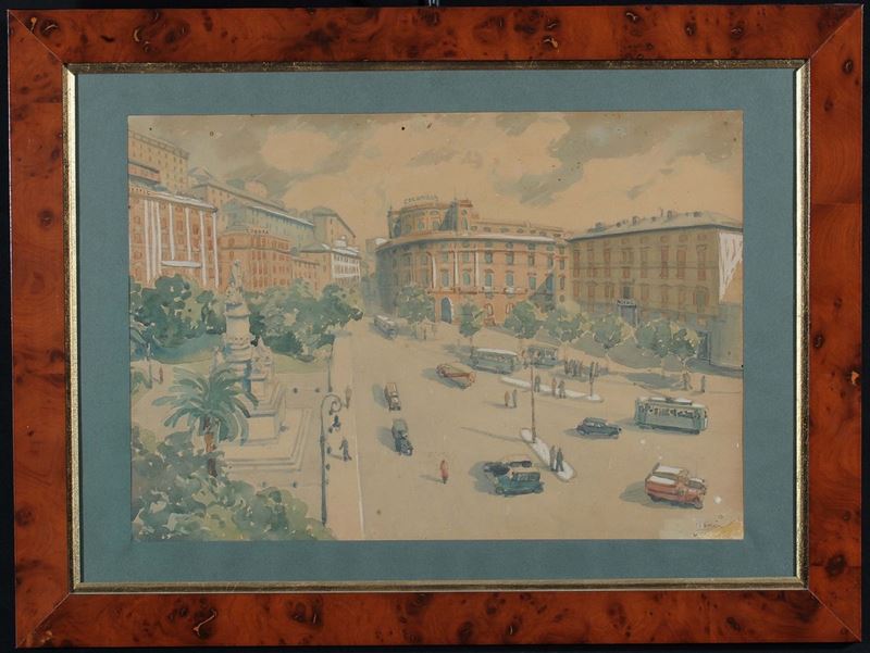 cinque acquerelli raffiguranti piazza Corvetto, piazza De Ferrari, piazza Acquaverde, piazza Verdi e corso Italia entro cornici in radica, cm 30,5x43,5