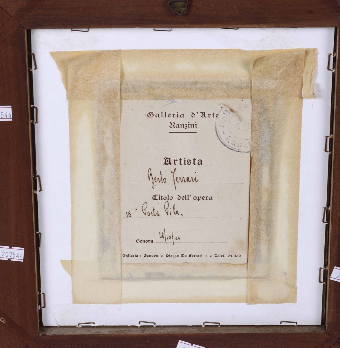 Al retro etichetta cartacea della galleria Ranzini di Genova
