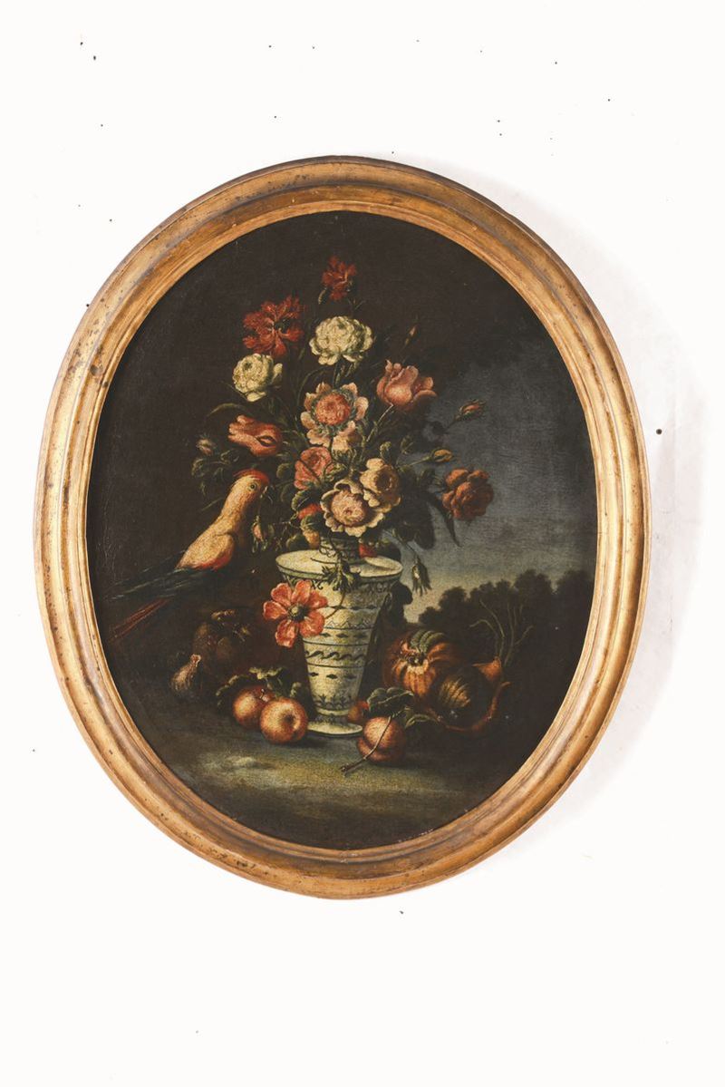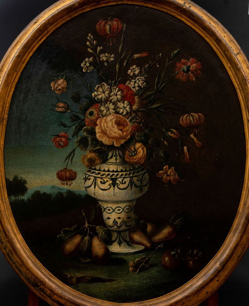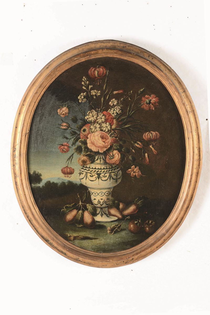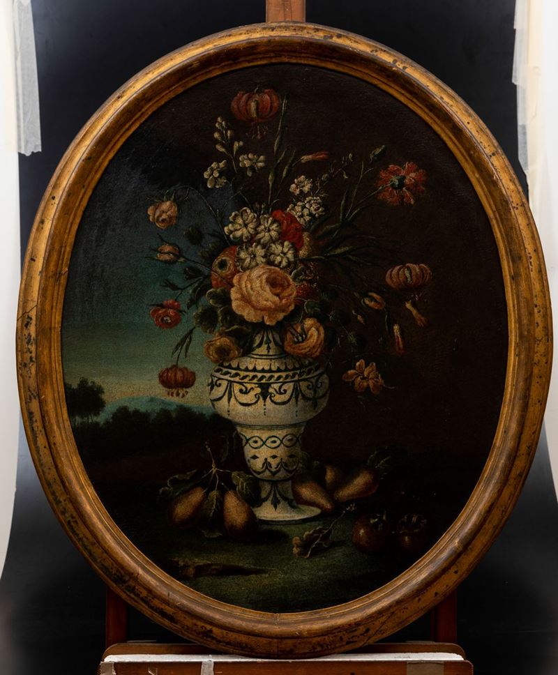 Felice Rubbiani (Modena 1677 - Villa San Pancrazio 1752), attribuito a Natura morta con vasi di fiori e frutti