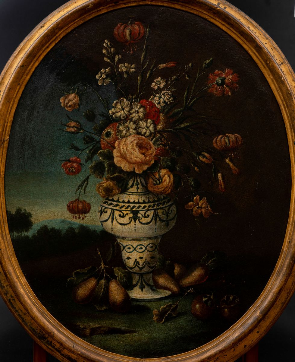 Natura morta con vasi di fiori e frutti