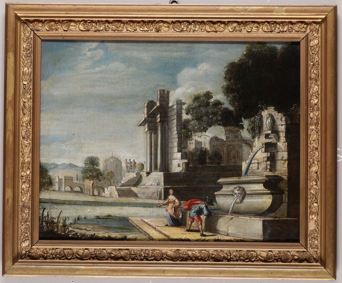 Scuola del XVIII secolo Paesaggio con architetture e coppia di giovani presso una fontana