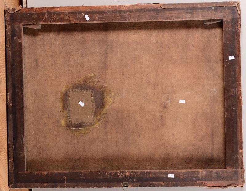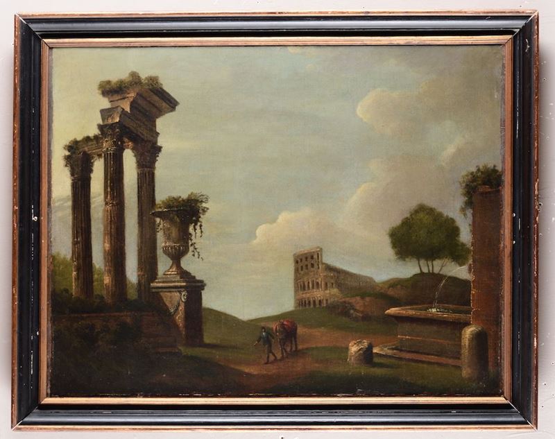 Scuola del XVIII secolo Veduta con rovine e viandanti