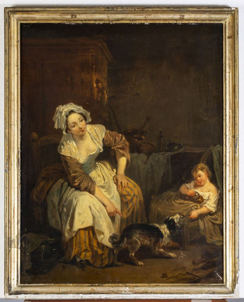 Scuola francese del XVIII secolo Scena di interno con donna, bambino e cagnolino