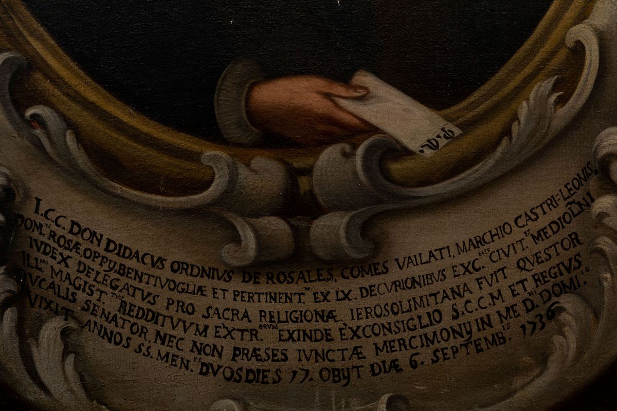 Come riferisce l'iscrizione, il personaggio ritratto, nato l'8 giugno 1681 a Milano e deceduto il 6 settembre 1736, fu marchese di Castelleone e conte di Vailate, questore e membro del Consiglio segreto, partecipò al Collegio dei Giureconsulti nel 1704. Nel 1705 fu decurione di Milano, questore del Magistrato straordinario e Senatore nel 1727.