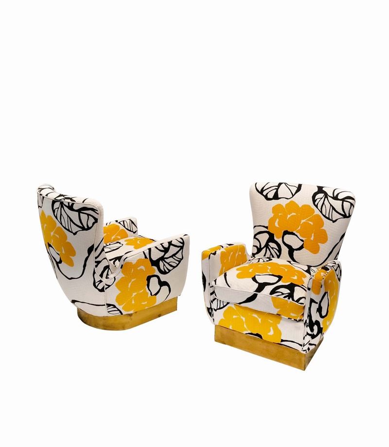 Coppia di poltrone con struttura in legno, rivestimento in tessuto e base laminata in ottone.