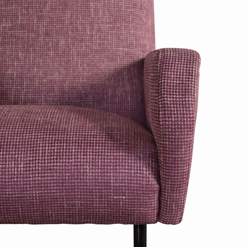 Coppia di poltrone con struttura in legno, sostegni metallo laccato e ottone. Rivestimenti in tessuto.
