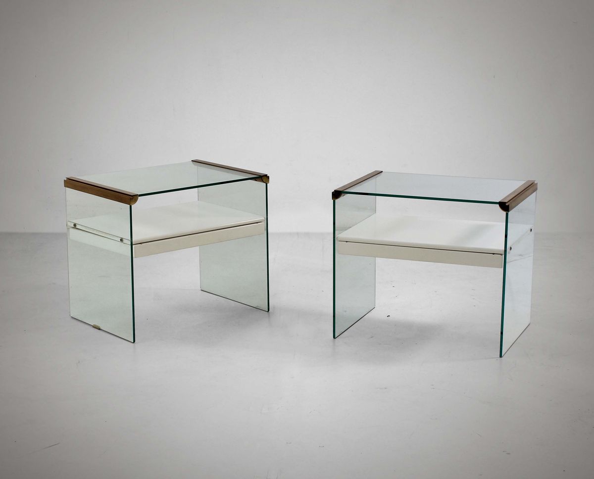 Due comodini con struttura in cristallo molato, legno laccato. Dettagli in ottone.