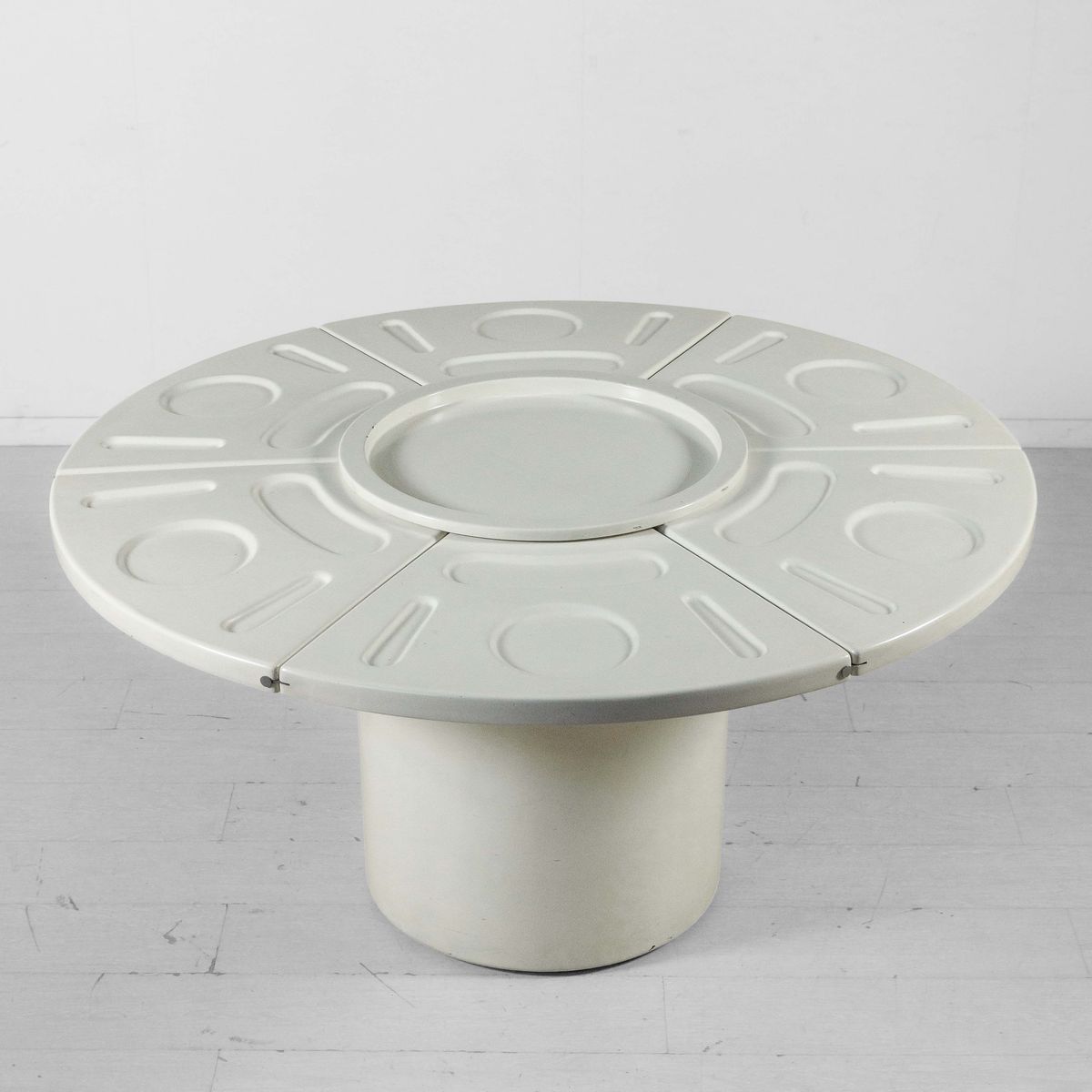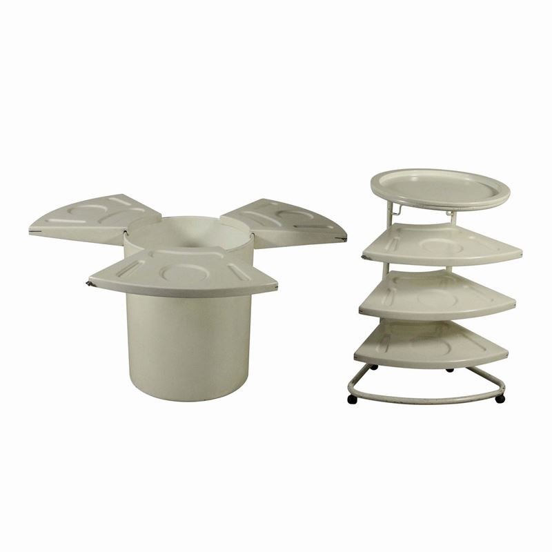 Tavolo rotondo mod. 230/s con piani a vassoio estraibili e impilabili su carrellino di servizio. Tavolo con struttura e piano in poliuretano rigido e carrellino in metallo tubolare laccato.