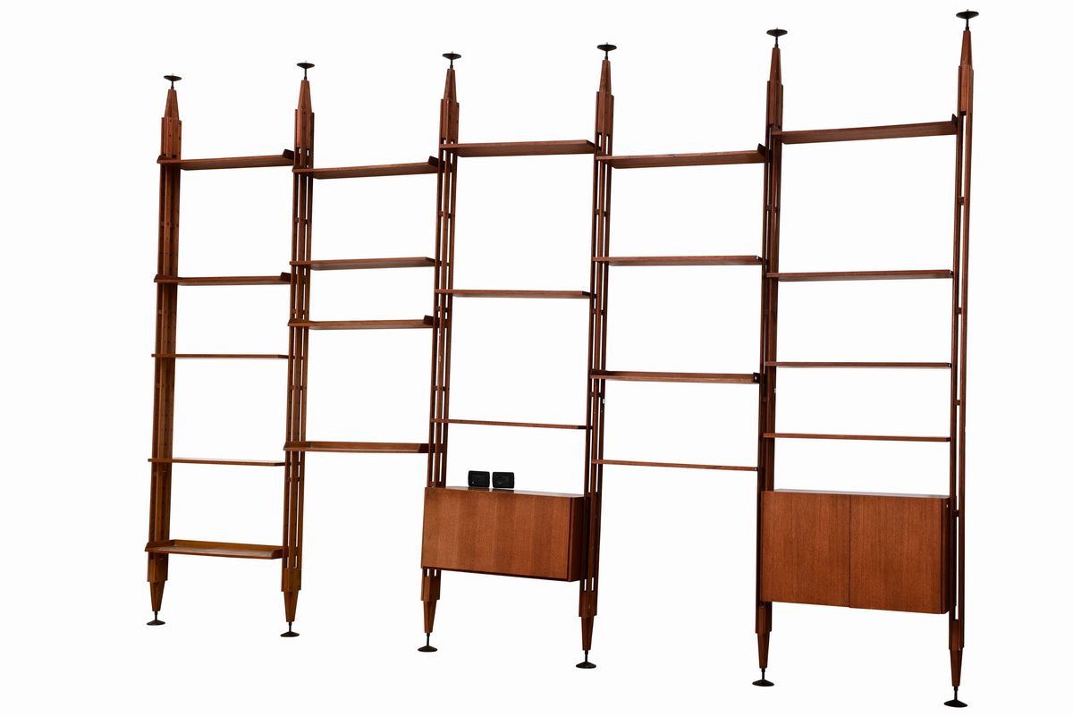 Libreria mod. Lb7 con struttura in legno, mensole e mobili contenitori, altezza regolabile e supporti in alluminio pressofuso laccato.