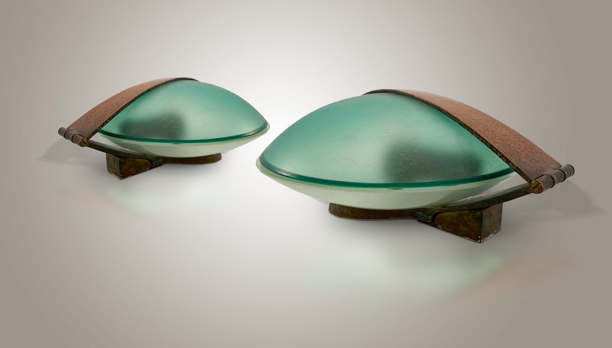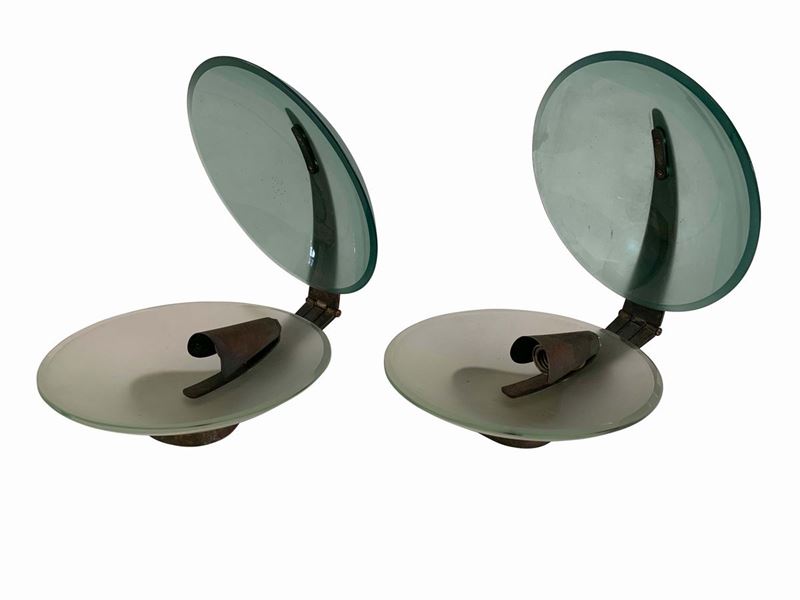 Coppia di lampade da tavolo o da parete con struttura in ottone e in vetro curvato, molato, colorato e sabbiato.