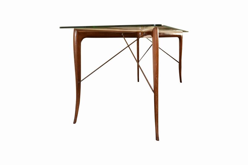 Tavolo rettangolare con struttura in legno, piano in cristallo molato e particolari in metallo laccato.