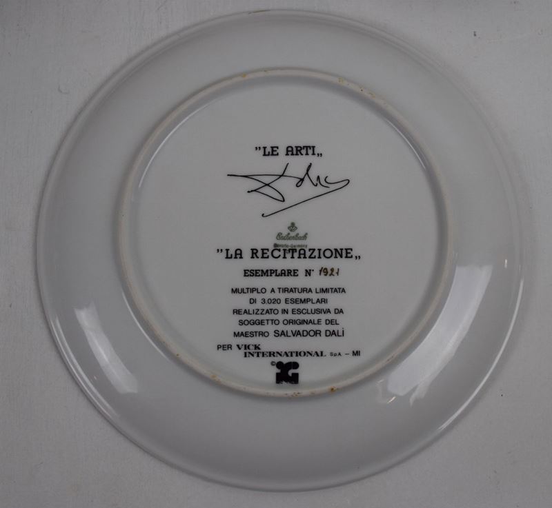 Cinque piatti in ceramica smaltata e serigrafata con bordo oro della serie Le Arti. Edizione limitata e numerata.