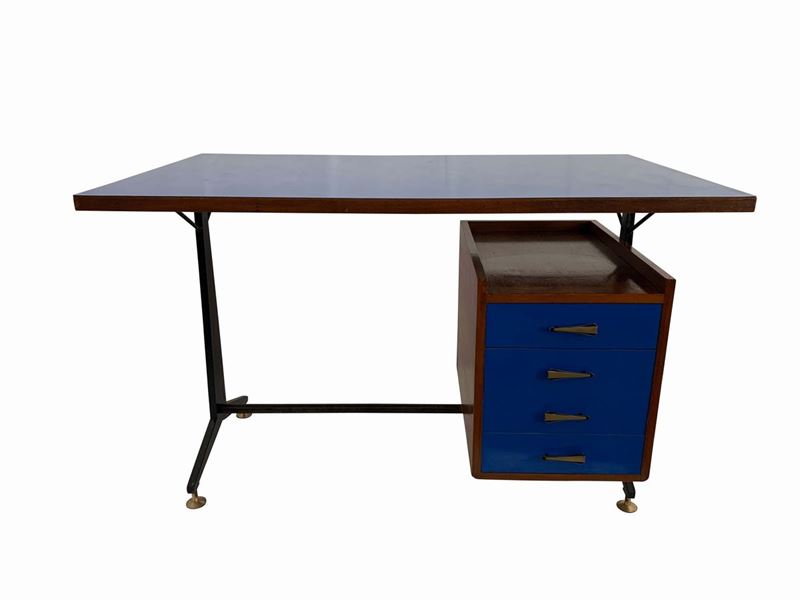 Scrivania con struttura in metallo laccato, legno e rivestimento in formica, particolari in ottone.