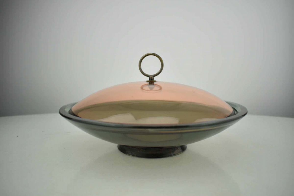 Scatola mod. 2004 con struttura in cristallo colorato, curvato, molato e particolari in ottone.