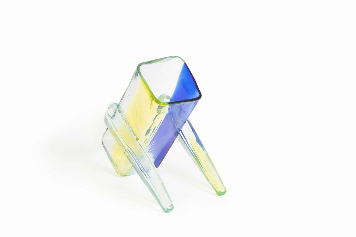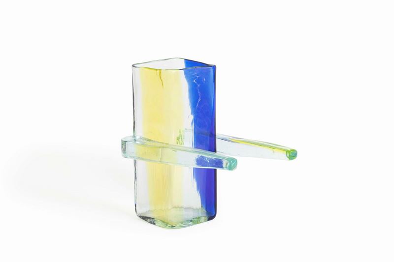 Vaso in vetro a parallelepipedo con decoro a fasce policrome con applicazioni a sostegno in forma di ala.