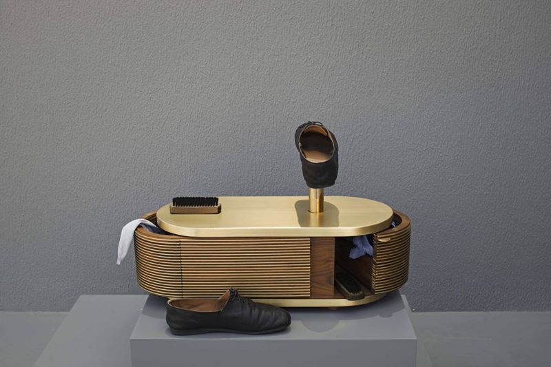Lotto offerto da Studio Manda con donazione al 50% soggetto ad IVA, spedito da Beirut, Libano Ispirato al tradizionale lustrascarpe di strada, Shoe Shine è un oggetto creato su misura per uso domestico. È realizzato in ottone massiccio e legno di noce americano, che gli donano un senso di nostalgia retrò e ne fanno un oggetto da esibire nella propria abitazione dando vita a nuove routine di pulizia delle scarpe.