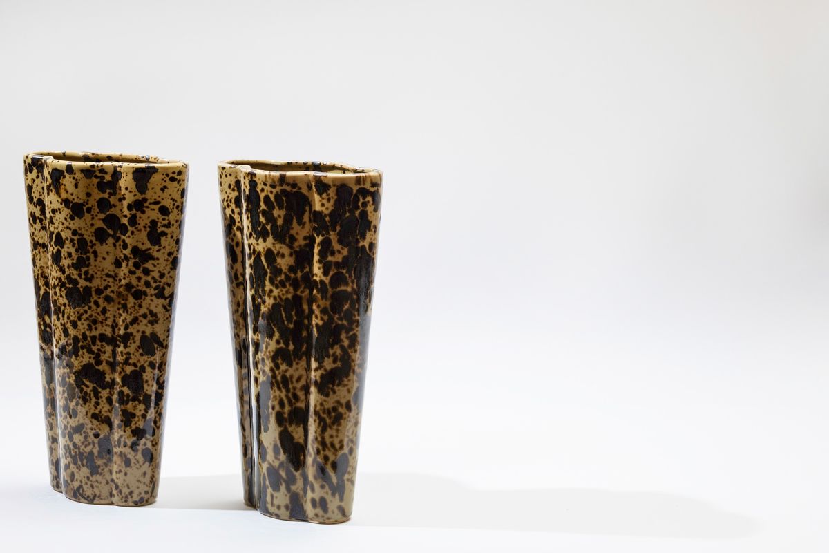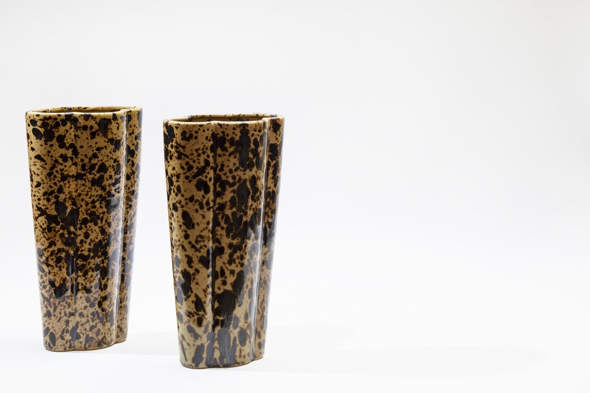 Coppia di vasi a forma quadrilobata in ceramica smaltata con decoro a macchie, altezza cm 32,5