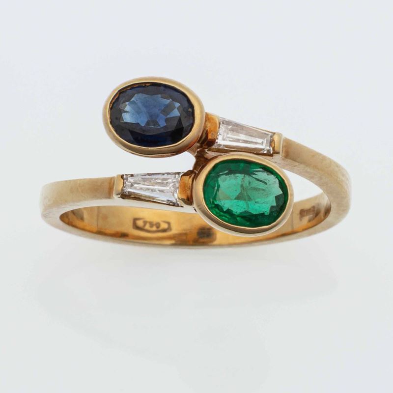 Anello contrariè con zaffiro, smeraldo e diamanti: gr 3.6; misura italiana 13
