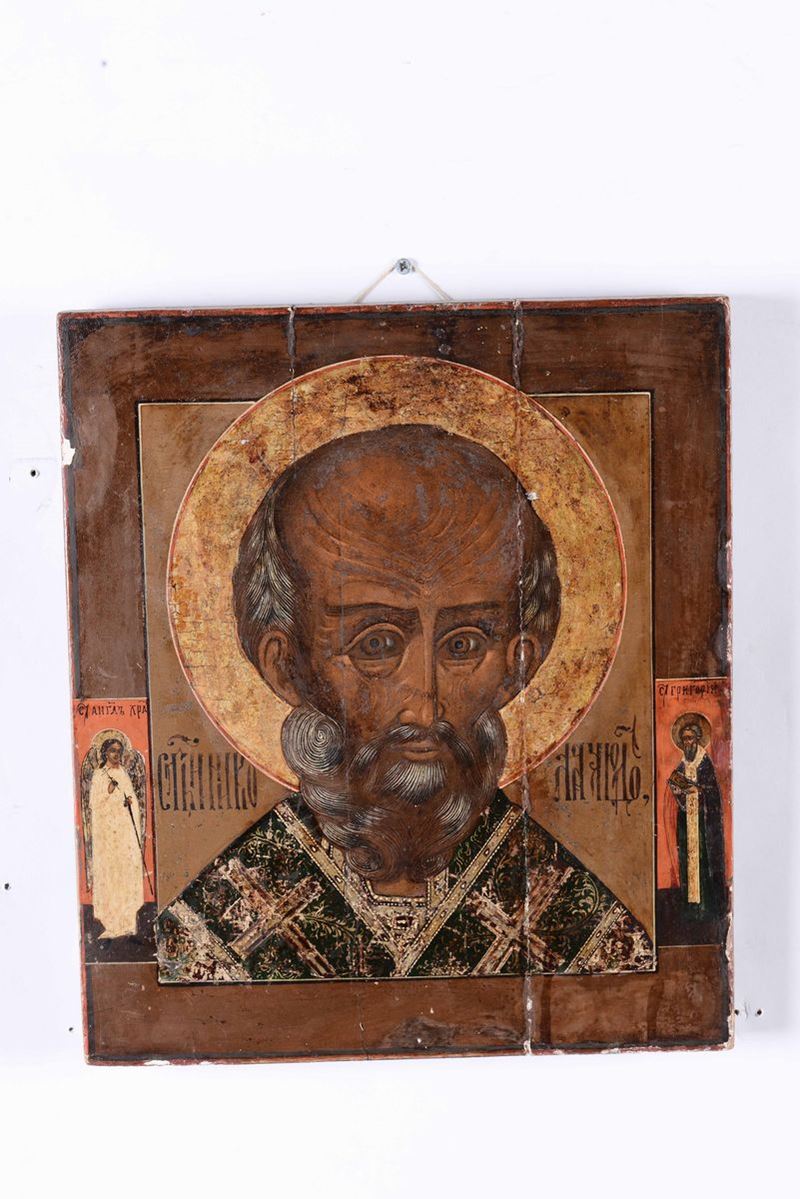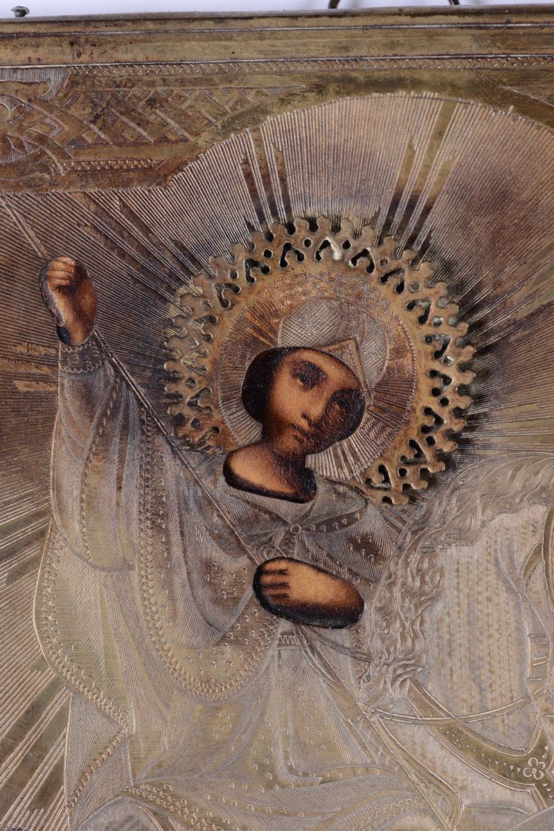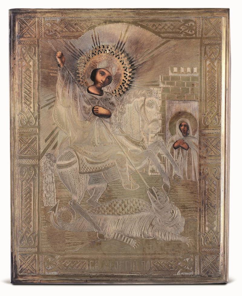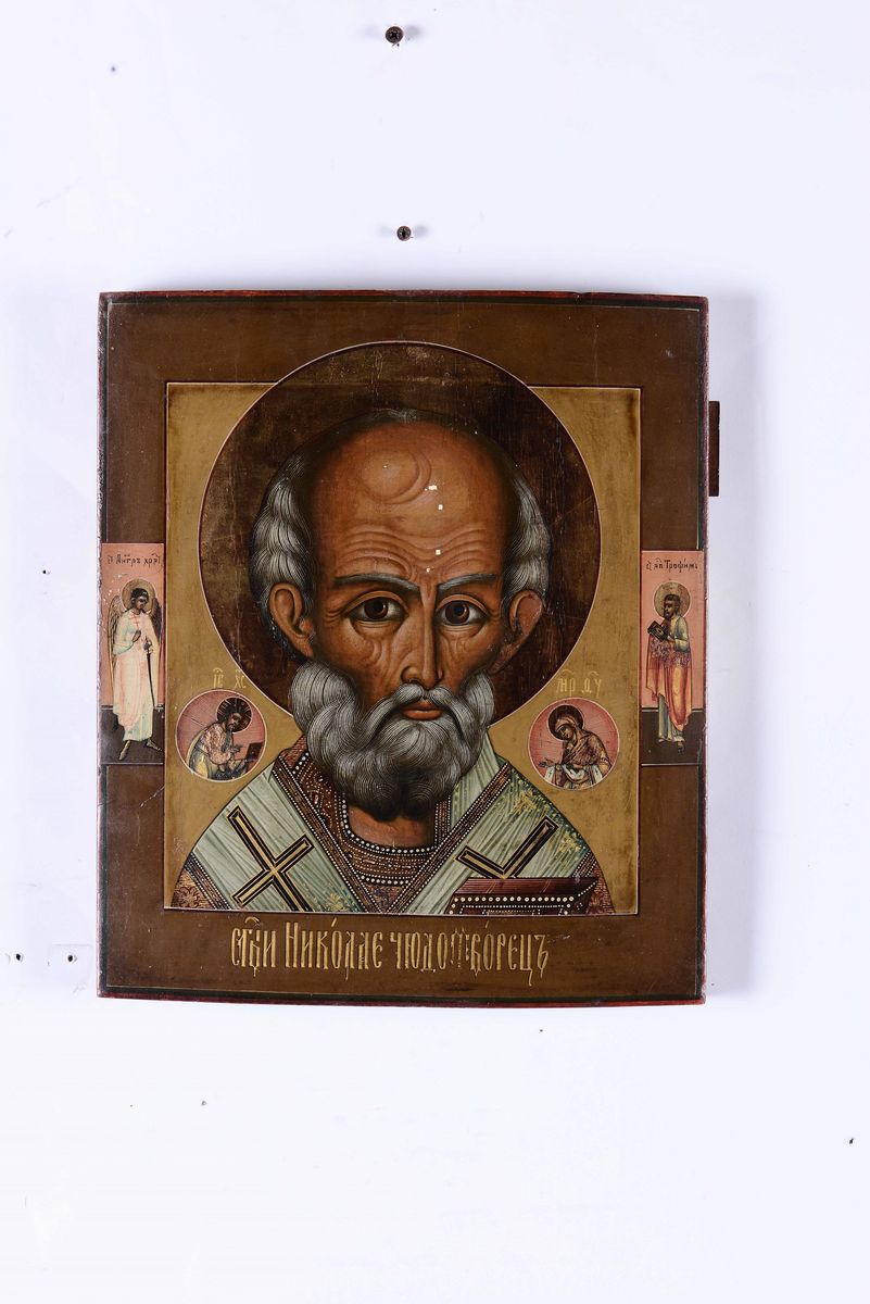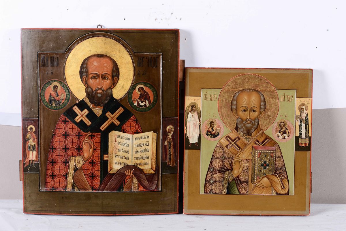 Lotto composto da sei icone raffiguranti San Nicola e una San Giorgio e il drago con riza in metallo argentato, Russia, [..]