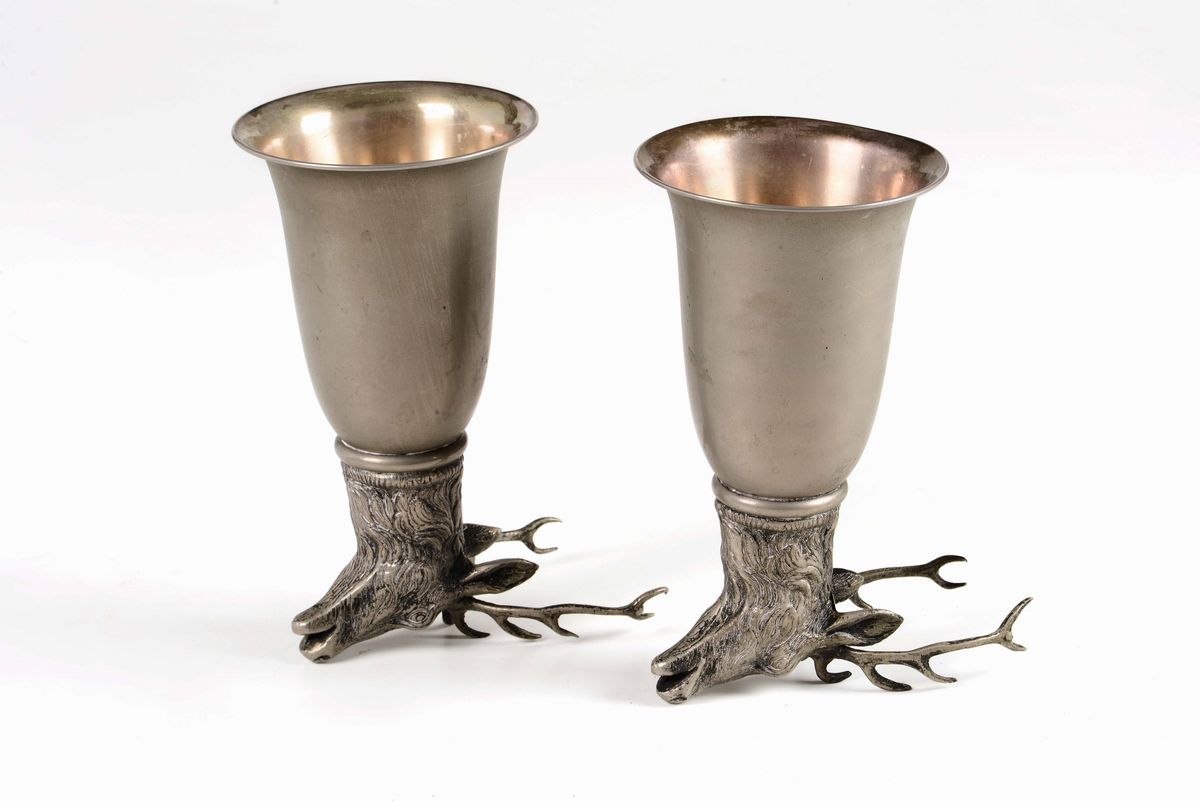 Coppia di boccali in peltro con teste di cervi . Fine XIX secolo