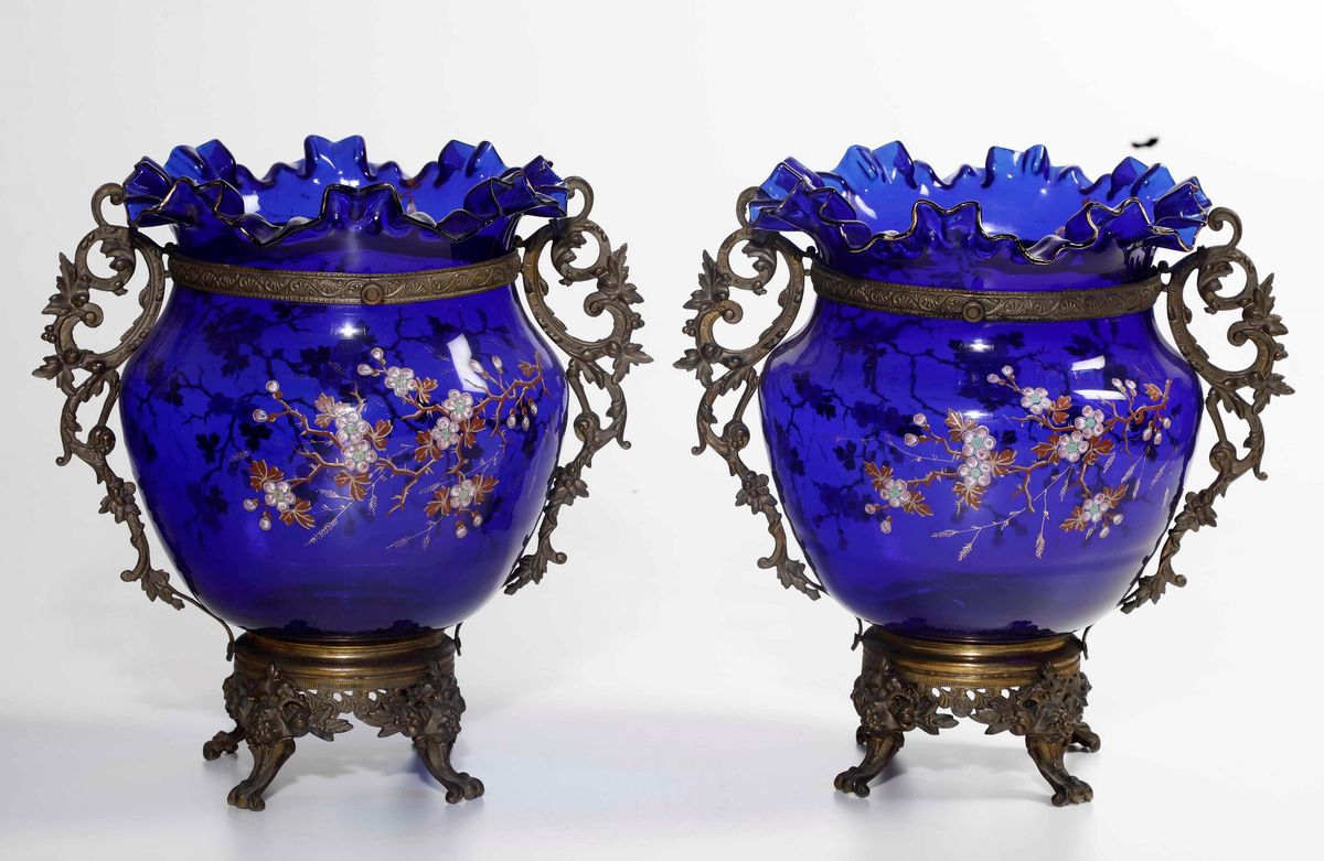 Coppia di vasi in vetro blu e montatura in metallo dorato