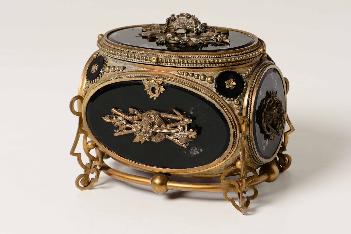 Scatola in metallo dorato e vetro, XIX secolo
