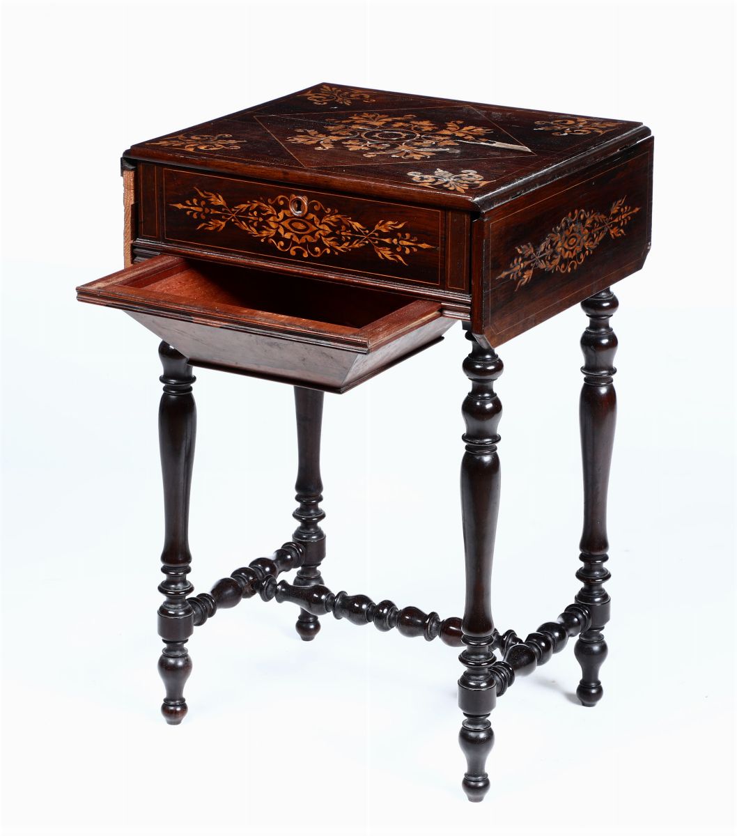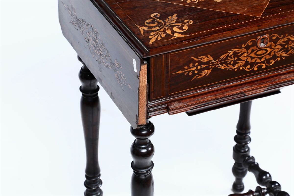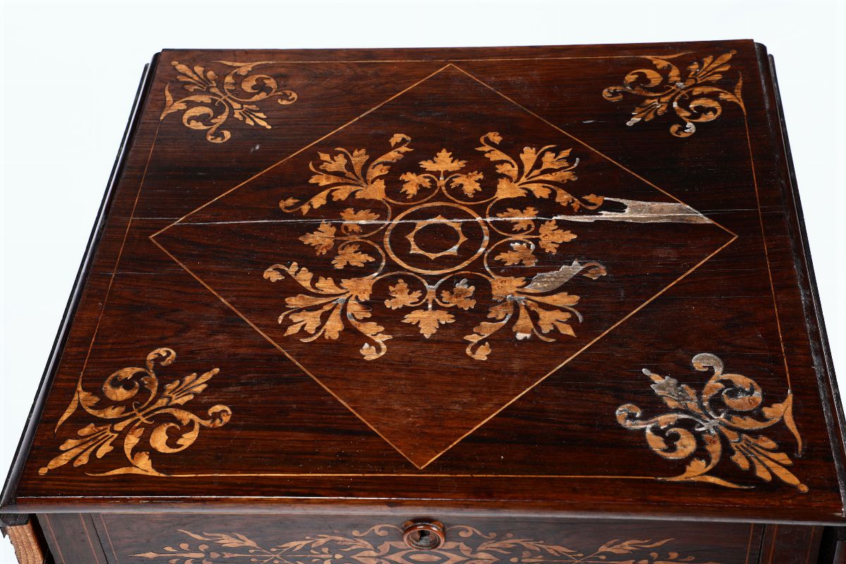 Tavolino a bandelle in legno impiallacciato ed intarsiato, XIX-XX secolo