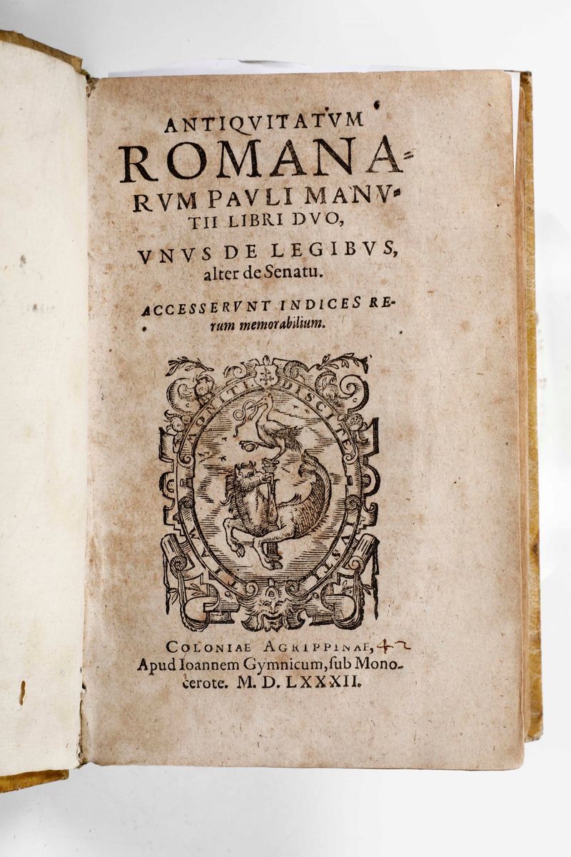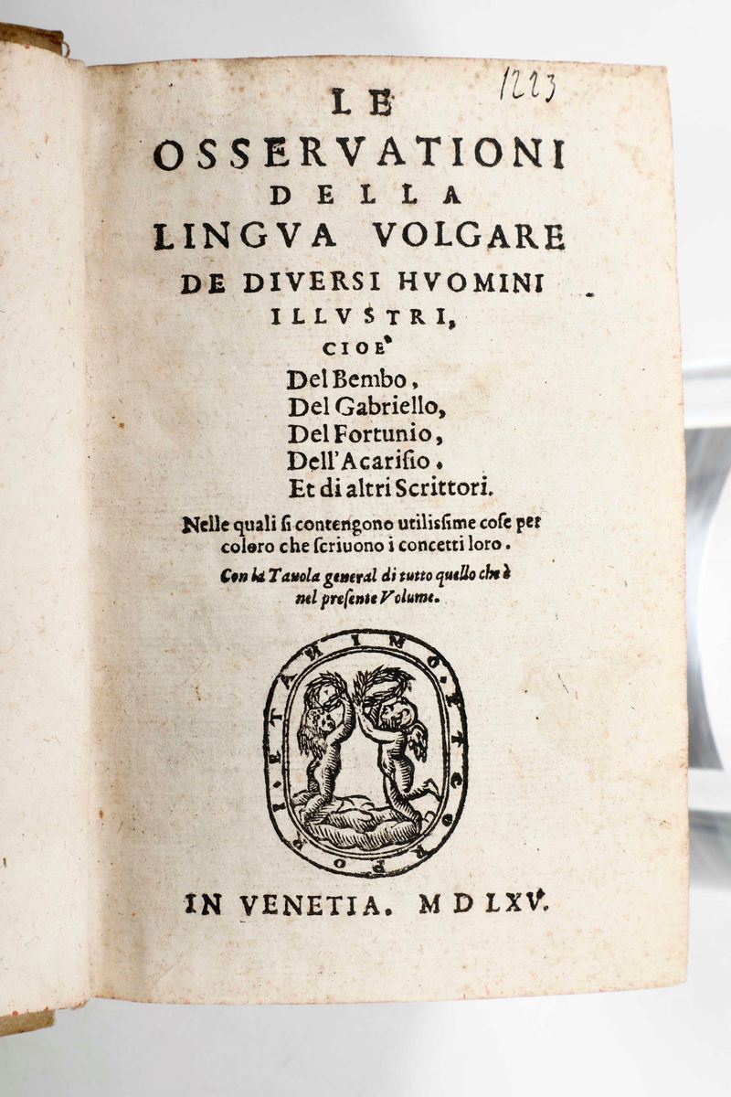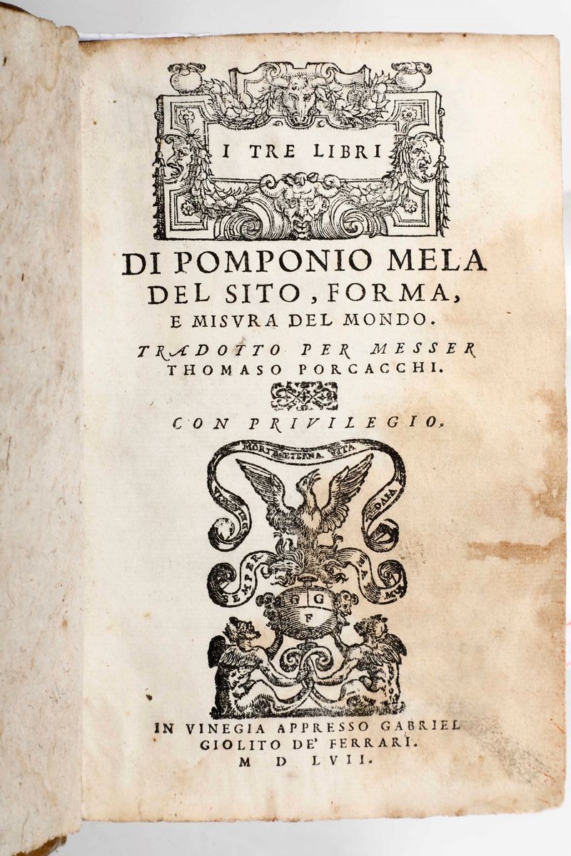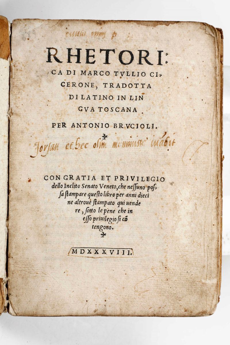 Rethorica di Marco Tullio Cicerone, tradotta di latino in lingua toscana per Antonio Brucioli...Venezia, Bartolomeo de Zanetti da Brescia, 1538. In-8°. Legatura in cartoncino alla rustica. SI AGGIUNGONO NEL LOTTO: Paolo Orosio Tradotto di latino in volgare per Giovanni Guerini da Lancisa novamente stampato...(Toscolano, 1530 circa), Alessandro Paganini Benacense. / Paolo Manuzio-Antiquitatum romanarum...Coloniae Agrippinae, 1582. / Le osservazioni della lingua volgare degli uomini illustri...Venezia, Rapazetto, 1565. / I tre libri di Pomponio Mela del sito forma e misura del mondo...Venezia, Giolito de' Ferrari, 1557-1558.